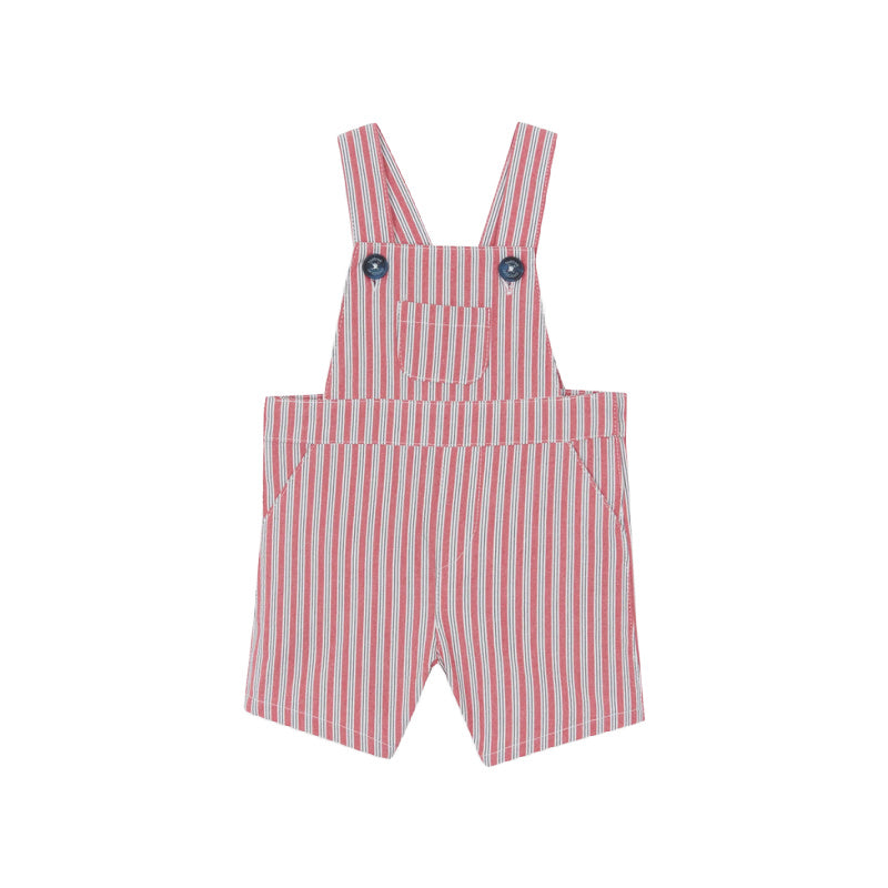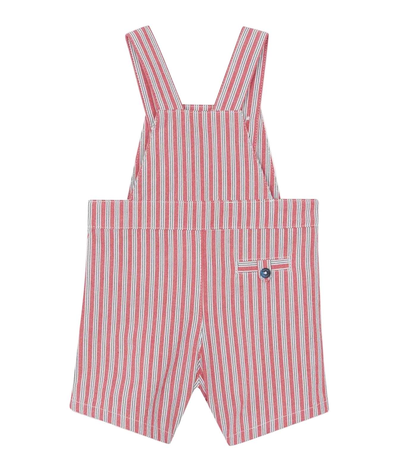 tartine et chocolat red salopette with cream and navy pinstripes, crafted from soft 100% cotton for all-day comfort. features a practical chest pocket, front pockets for little essentials, and a tabbed back pocket for added style. inner leg snaps make diaper changes quick and easy.