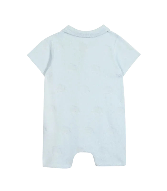 tartine et chocolat sky blue romper crafted from soft 100% terry cotton. features a classic collared neckline, short sleeves, and full front button closure for easy dressing. practical snap closures at the inner legs make diaper changes a breeze. the entire piece is decorated with a charming textured hedgehog pattern that adds playful character.