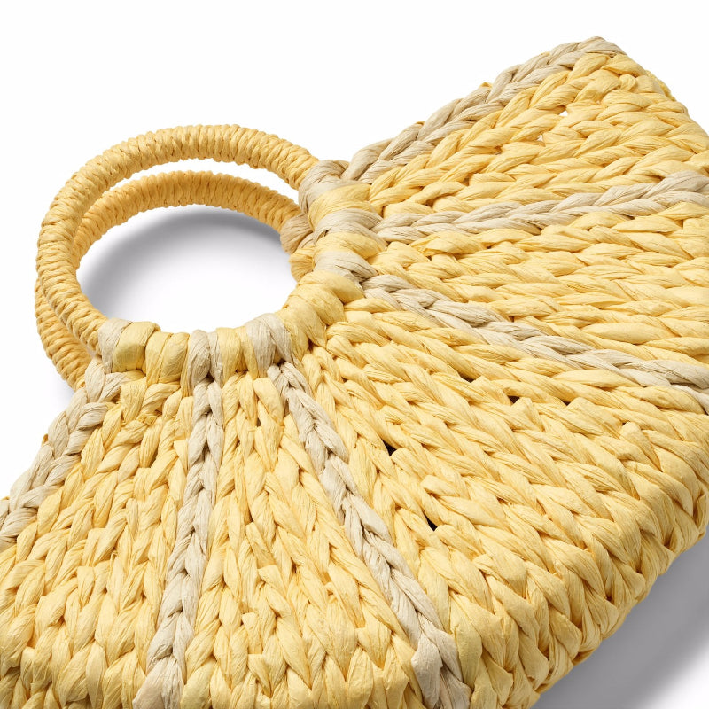 adorable molo lemon-shaped straw bag in a cheerful yellow. crafted from 100% paper straw, it's lightweight and perfect for beach days, picnics, or farmers market runs. the circular top handle makes it easy to carry, while the playful fruit design adds a fun pop of personality to any outfit.