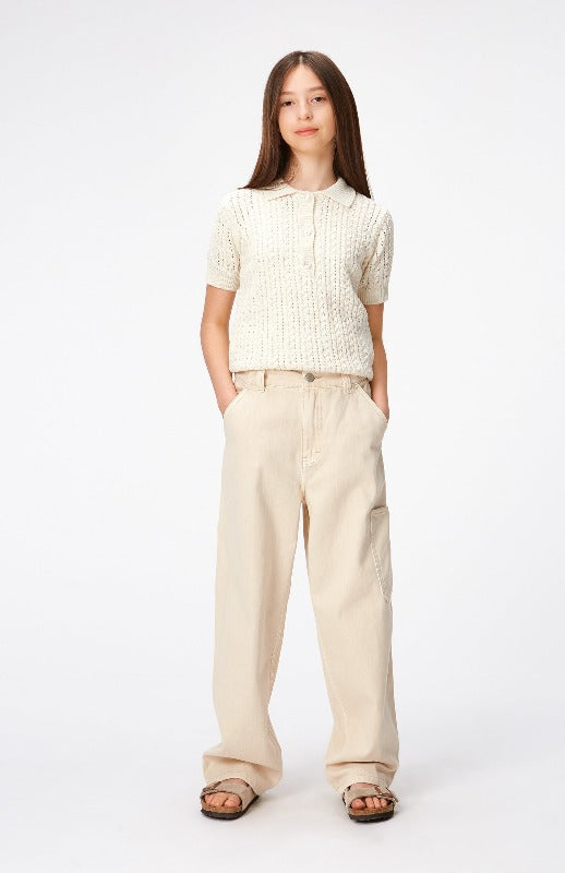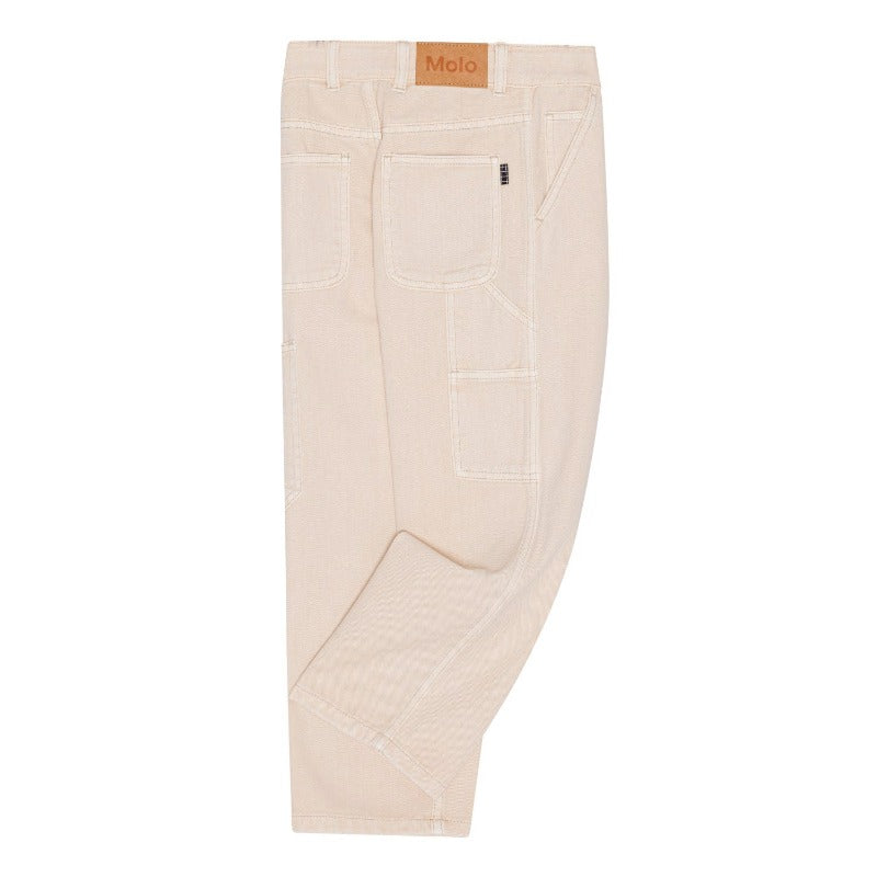 molo archer trousers crafted from luxurious cotton and featuring a natural color, these trousers are perfect for both boys and girls. the wide leg and classic 5 pockets provide a timeless silhouette, while the additional side leg pocket and button fly zipper add further functionality for these everyday pants.