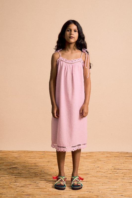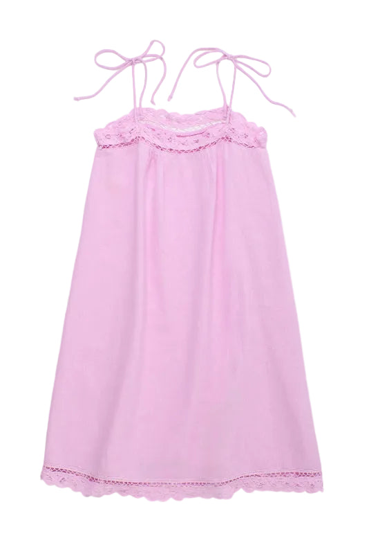 effortless summer style meets artisanal charm in this maison mangostan pink cotton-linen blend dress. delicate spaghetti straps with adjustable ties let you customize the fit, while intricate crochet detailing adorns the hem and neckline for a touch of handcrafted elegance. perfect for warm days, casual outings, or breezy evenings—throw it on and go.