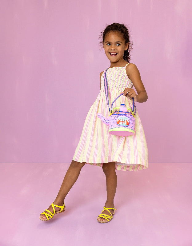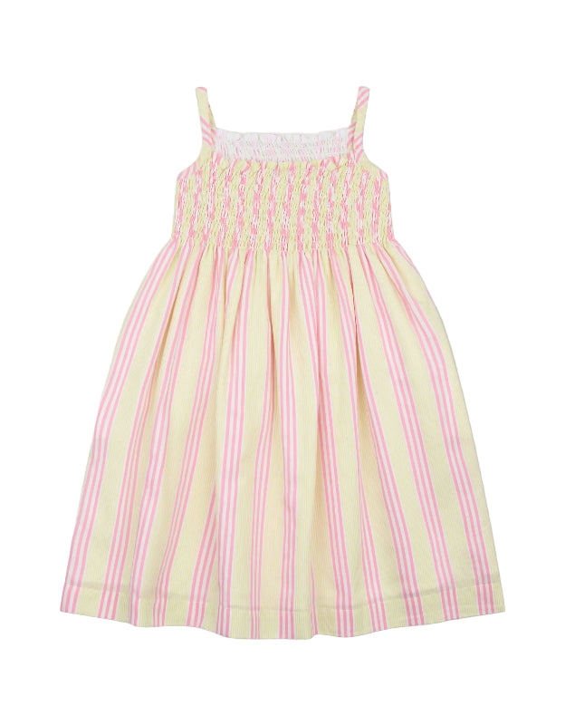 oilily cotton dress featuring sunny yellow and pink stripes crafted with a special weaving technique that creates a subtle 3D effect, making it shimmer beautifully in the light. the smocked bodice with delicate thin straps offers a comfortable, flattering fit perfect for warm days. features slash pockets and is fully lined. an effortless piece that brings vibrant color and texture to any summer wardrobe.