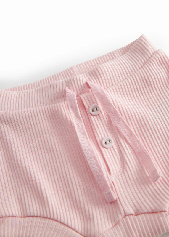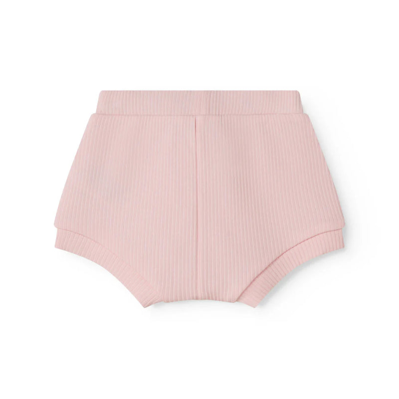 marmar copenhagen poma baby bloomers in rose. these small bloomers have cute details like a button placket and a decorative ribbon at the waist. the bloomers are soft and stretchy, but still hold their shape.