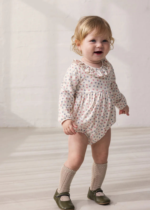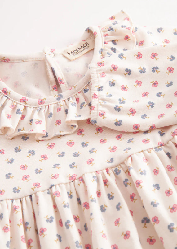 marmar copenhagen long-sleeved romper with ruffle details at the front and button closure at the back. the romper is closed with snaps between the legs for easy diaper changes. soft, stretchy and comfortable to wear.