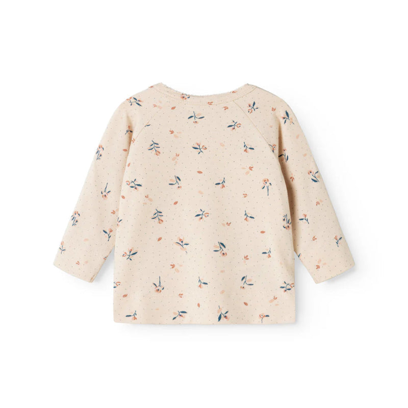 marmar copenhagen long sleeve tut wrap top in beige with an all over roses print. this soft baby top has an easy snap closure on the side and a wrap neckline.