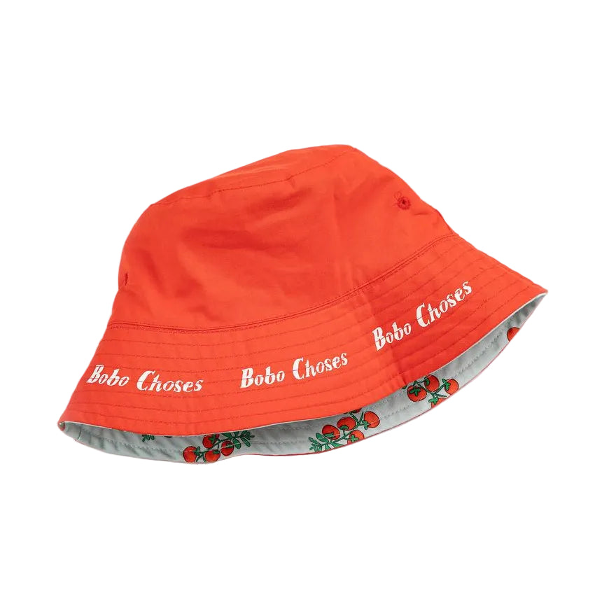 this reversible bobo choses bucket hat offers two looks in one. one side features a cheerful all-over tomato print on light blue, while the reverse showcases solid red with bobo choses text along the brim.