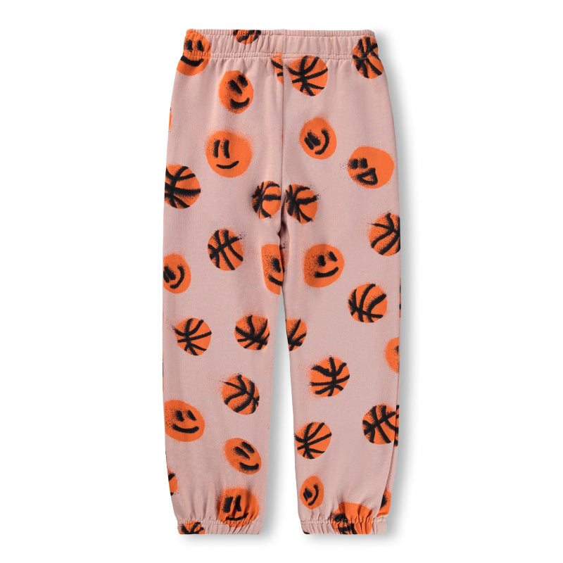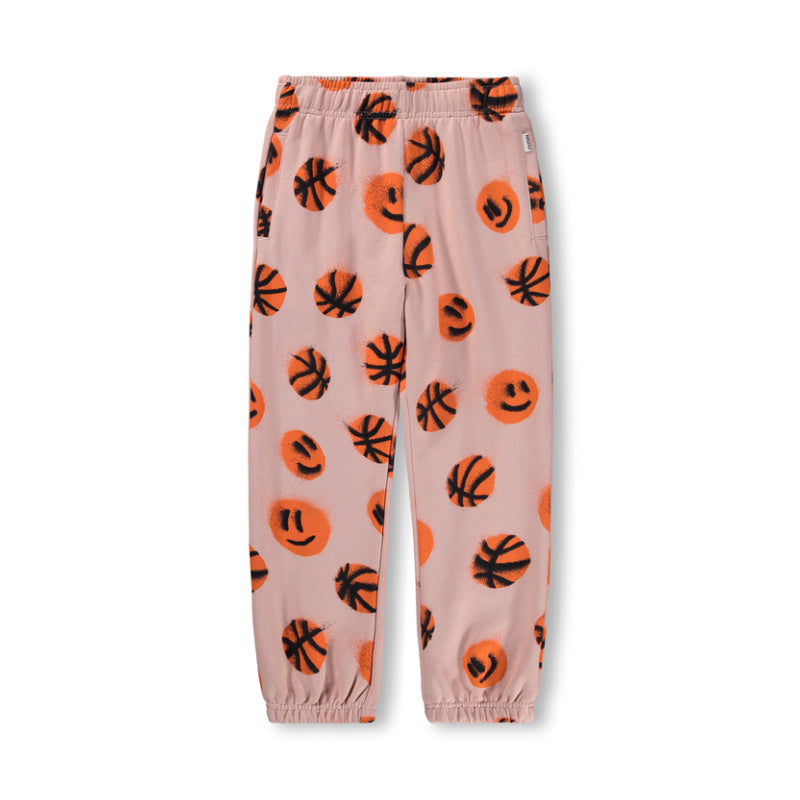 molo rose colored sweatpants featuring an all over basketballs print. these pants have pockets on the sides, elastic waist with an internal drawstring ensuring they fit well all day and are comfortable to wear. the pants have a regular fit with cuffed ankles.