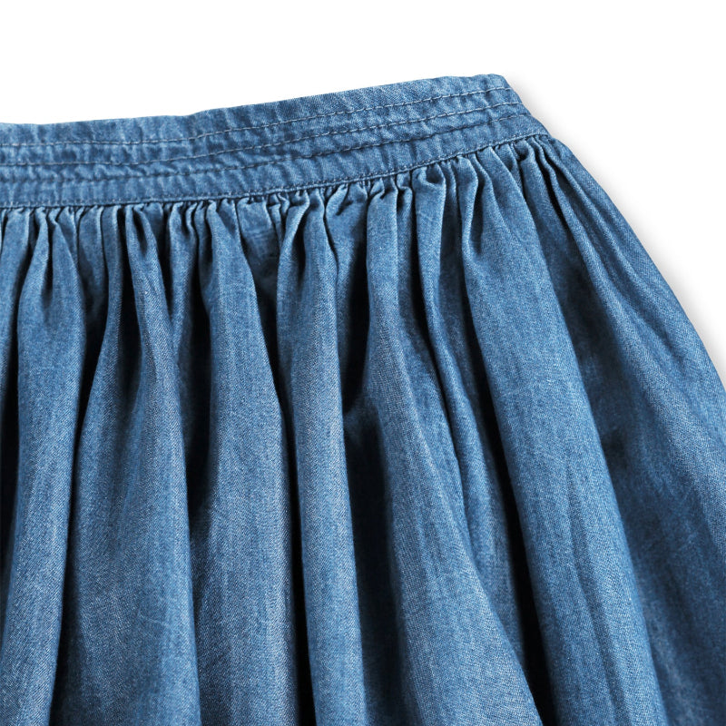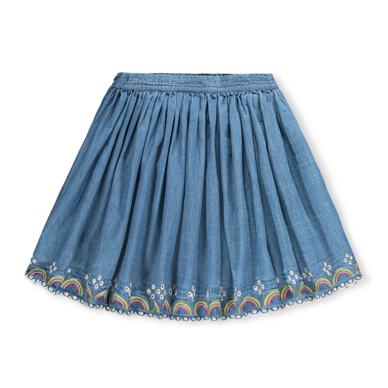 molo bernie mini skirt made with organic cotton. this skirt is in light blue denim and features decorative embroidery details on the hem. made with a gathered elasticated waistband, it's as comfortable as it is stylish.