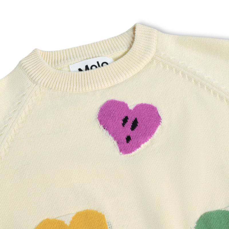 soft and sweet, this molo cream-colored knit sweater features a playful colorful hearts print that'll have little ones smiling. crafted from organic cotton, it's gentle on delicate skin and perfect for layering through the seasons. ribbed edges keep everything in place while your baby or toddler plays and grows.