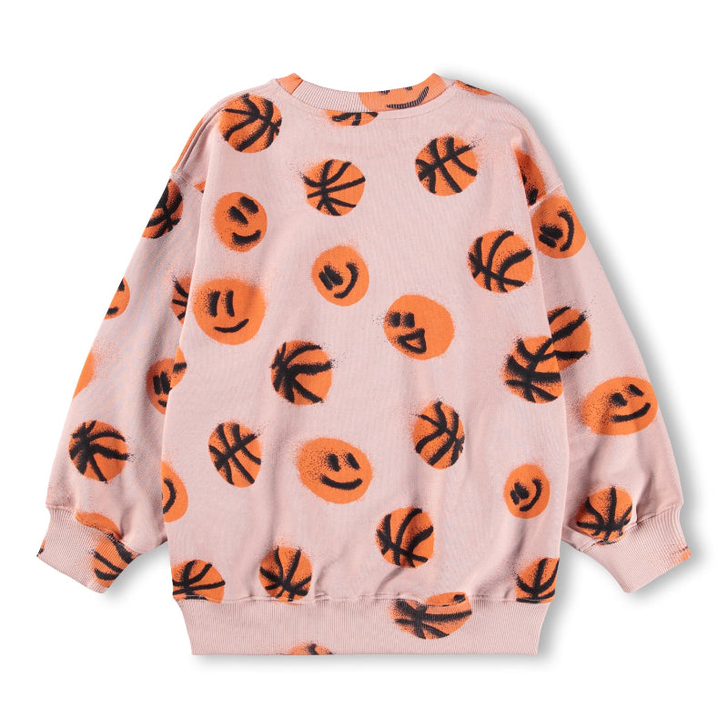molo monti sweatshirt crafted from organic cotton in a rose base with all over basketballs print. the sweatshirt has a round neckline and ribbed edges.