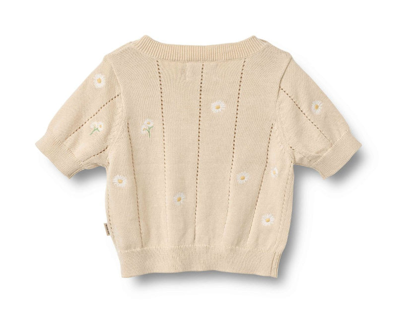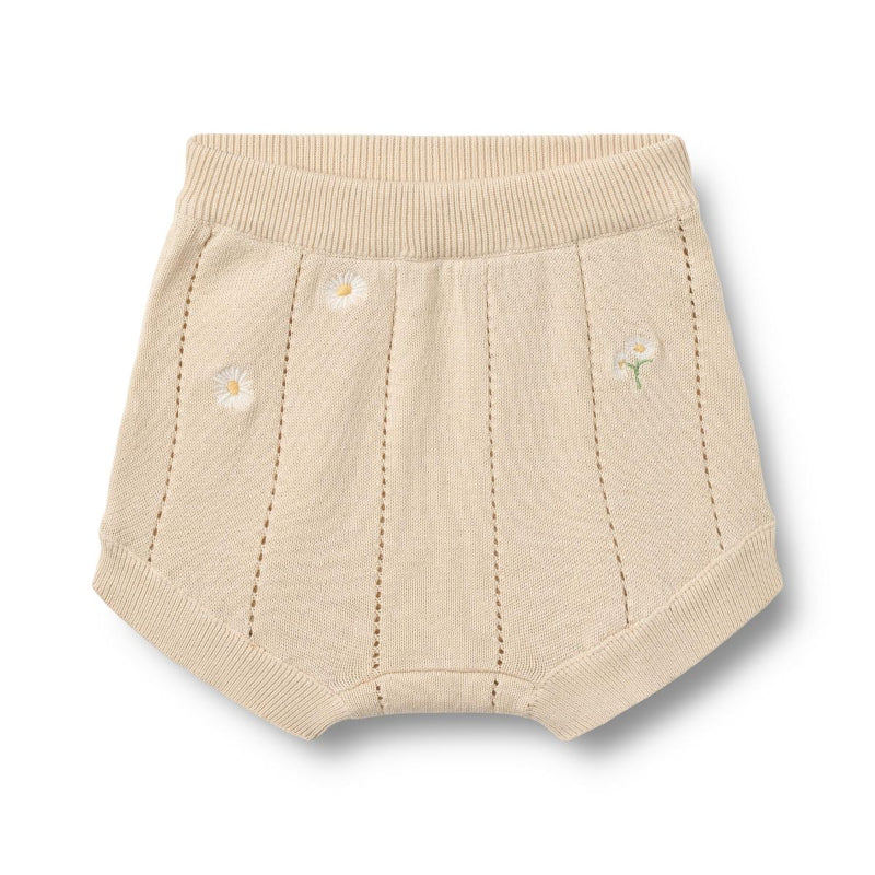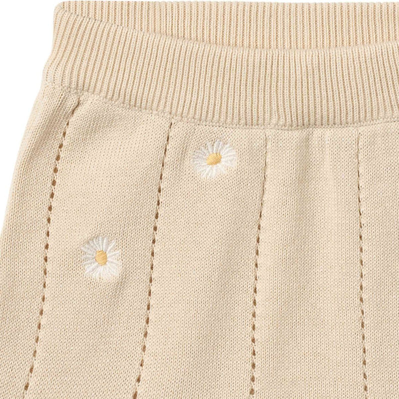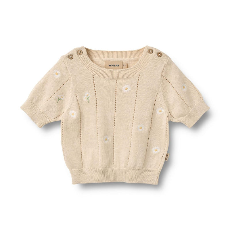 this wheat two-piece baby set crafts effortless style from breathable organic cotton in an open knit weave. the short-sleeve top features shoulder buttons for quick changes, a classic round neckline, and sweet white daisy embroidery scattered throughout. pair it with the coordinating bloomers, complete with a wide ribbed waist and snug ribbed leg openings for a secure fit.