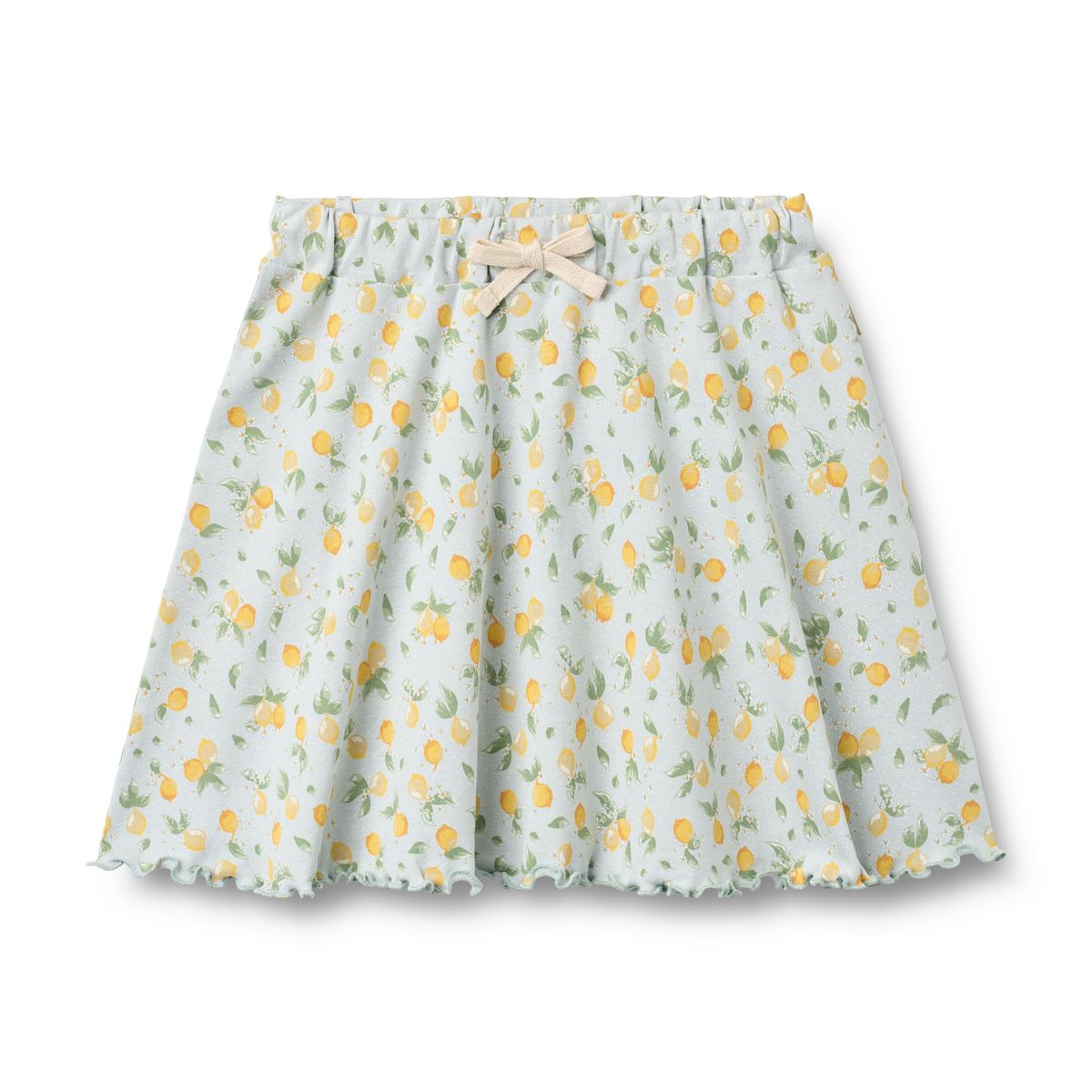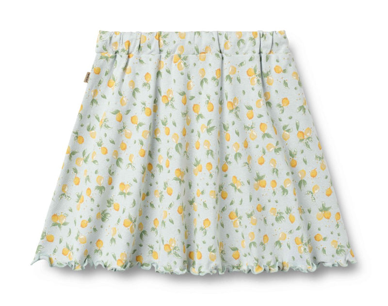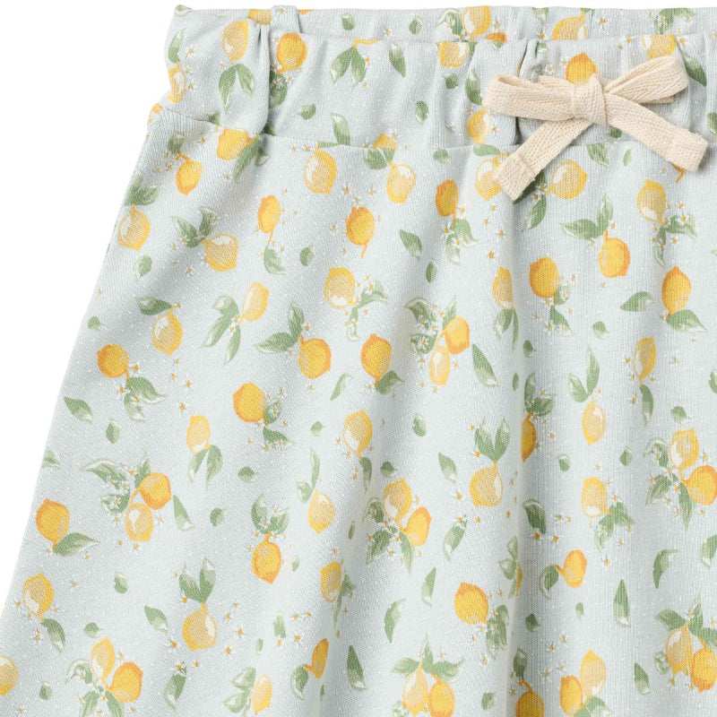 wheat blue jersey skirt adorned with a playful all-over lemon print. made from breathable organic cotton, it's soft against skin and perfect for warm weather. the elasticated waist with decorative drawstring offers an adjustable, flattering fit, while gathered fabric and a lettuce hem create effortless movement and a charming finish.