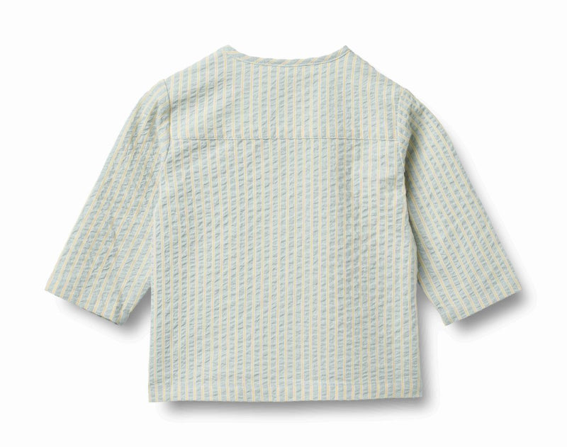 wheat lightweight button-up shirt crafted from organic cotton seersucker. featuring a collarless round neckline and long sleeves with a structured back yoke. the soft light blue and cream stripes add a fresh, summery touch that works for any occasion. gentle on delicate skin and easy to care for, this versatile piece is a wardrobe essential.