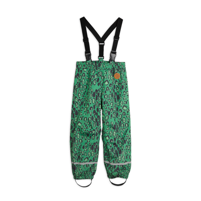 mini rodini waterproof shell trousers with a green leopard all-over print made from 100% recycled polyester. the trousers have taped seams and are coated with BIONIC-FINISH® ECO. the functional and heavy-duty shell fabric is breathable with 5000 g/m2/24h and waterproof with 10 000 mm water columns. the trousers have a lining in recycled polyester mesh, detachable shoulder straps, and durable silicone straps to place under the feet. the reflective prints at the cuffs increase visibility in the dark. this model can be also worn as an alternative to a pair of rain trousers.