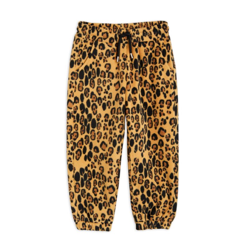 mini rodini leopard fleece trousers in beige. made with 100% recycled polyester, these pants feature an all-over leopard print, adjustable elastic waistband, and elastic cuffs. decorative rear pocket with a mini rodini panther label adds a playful touch.