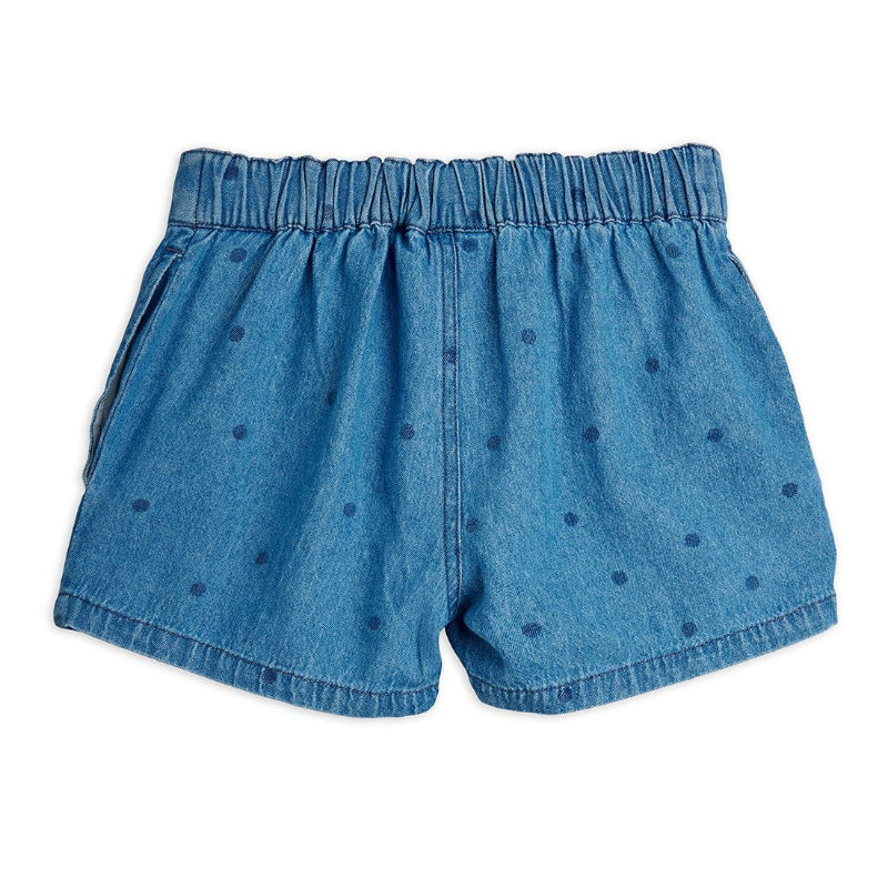 mini rodini lightweight denim shorts featuring an adorable all-over dot pattern with an embroidered dachshund detail at the hem. the elastic waistband with front button makes getting dressed a breeze, while practical side pockets add functionality. crafted from 100% organic cotton denim with a soft, comfortable feel, they're perfect for warm weather play and everyday adventures.