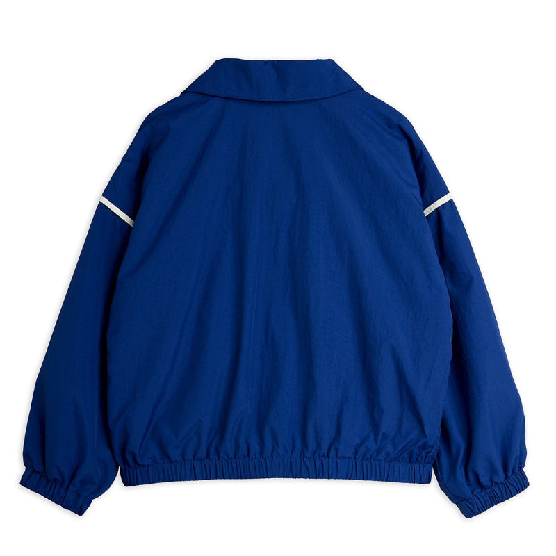 cosmic-inspired blue jacket from mini rodini crafted from 100% recycled nylon with a water-repellent BIONIC-FINISH® ECO coating. the collared design features a full-length zipper with ring puller for easy on-and-off, while an embroidered planet motif adds playful personality to the chest. mesh lining keeps things comfortable, and contrast piping at the sleeves gives it an extra edge. practical front welt pockets, elasticated cuffs, and a fitted hem complete the look.