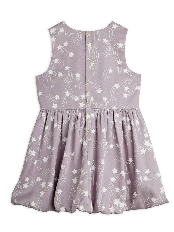 mini rodini sleeveless woven dress featuring a playful all-over starfall print. the gathered waist creates a flattering fit, while the bubble skirt with elasticated hem delivers a voluminous silhouette. an embroidered planet patch adds a charming detail at the chest, and the snap button closure at the back neck makes getting dressed a breeze.