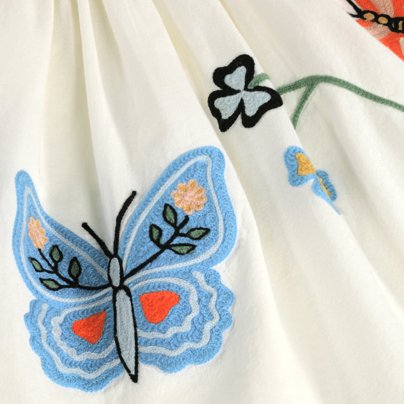this molo organic cotton woven dress brings effortless charm to any day. crisp white fabric serves as the perfect canvas for floral and butterfly embroidery adorning the chest and skirt. short bell sleeves add a playful touch, while the gathered skirt creates a comfortable, flattering silhouette. a back zipper closure ensures easy dressing.