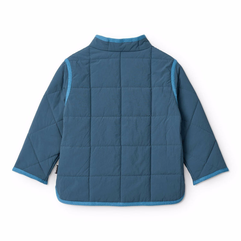 molo harrie baby jacket in oceanica—a practical layer that keeps little ones cozy and dry. crafted from recycled nylon with a quilted pattern, this water-repellent jacket shields against splashes and light rain without harsh chemicals. the regular fit allows room for layering, while side pockets add functionality for tiny hands. front button closure and contrast edge tape create a polished look that transitions seamlessly from playground to everyday adventures.