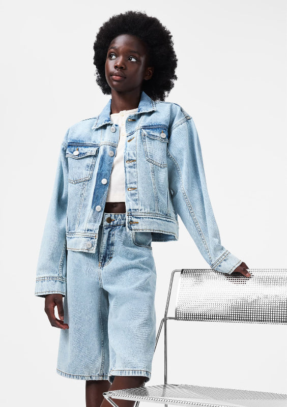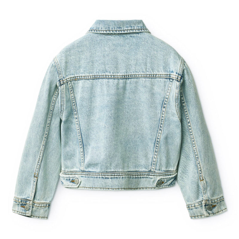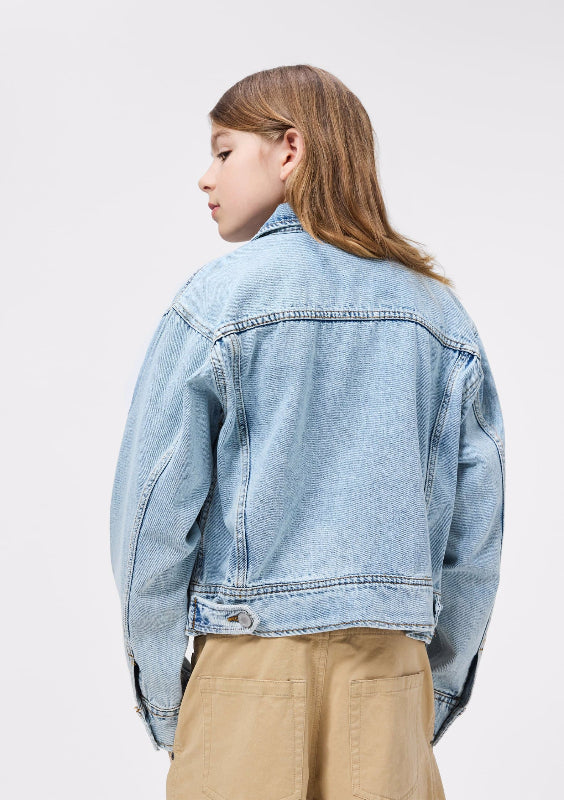 this molo versatile denim jacket brings timeless style to any kid's wardrobe. crafted from soft, organic cotton in a gentle light blue wash, it's comfortable enough for everyday wear. practical chest pockets and slash pockets keep essentials within reach, while the relaxed fit works for both boys and girls. perfect for layering over tees or dresses, this jacket combines durability with a laid-back vibe that kids actually want to wear.