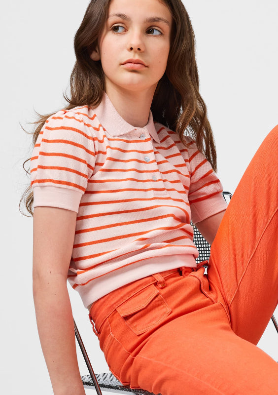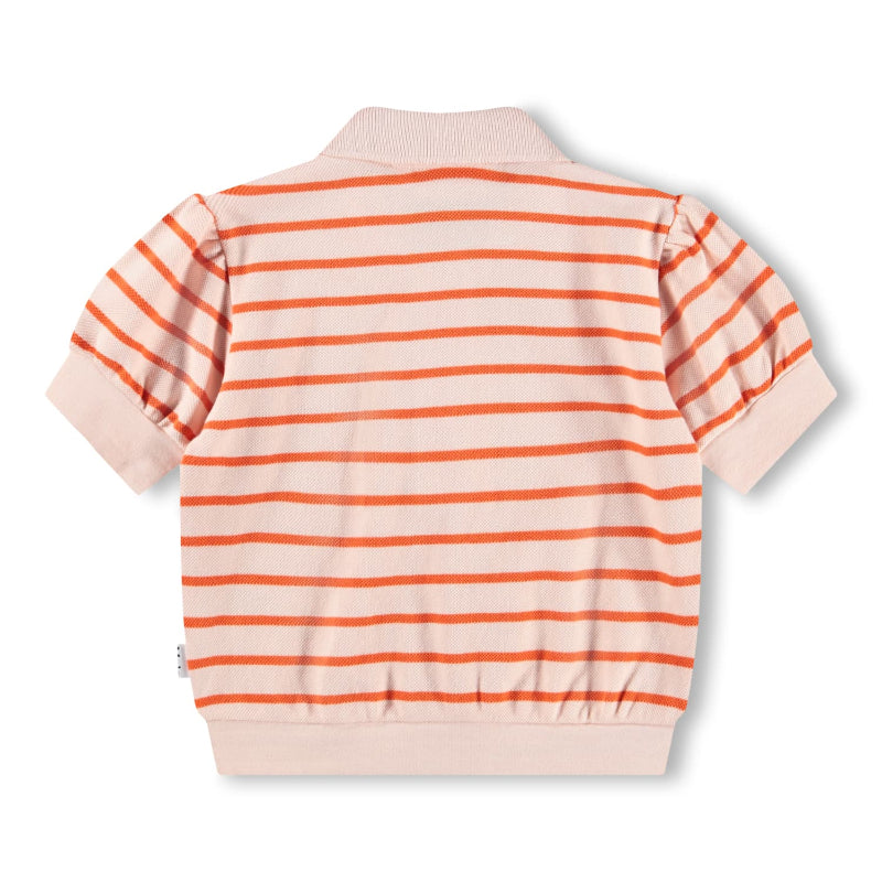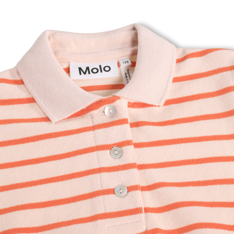 molo charming polo made from soft organic cotton in playful pink and orange stripes. features short puff sleeves, a classic three-button placket and collar. ribbed detailing at the arms and waist provides a comfortable, flattering fit.