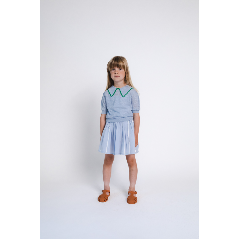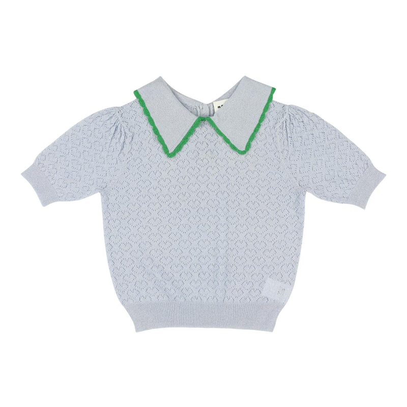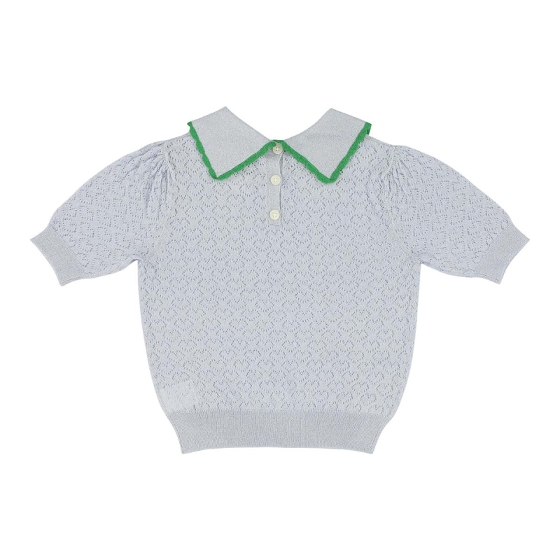 morley saxy girl's polo shirt in sky blue with knit detail. features short sleeves, an exaggerated collar with green trims and ribbed trims.