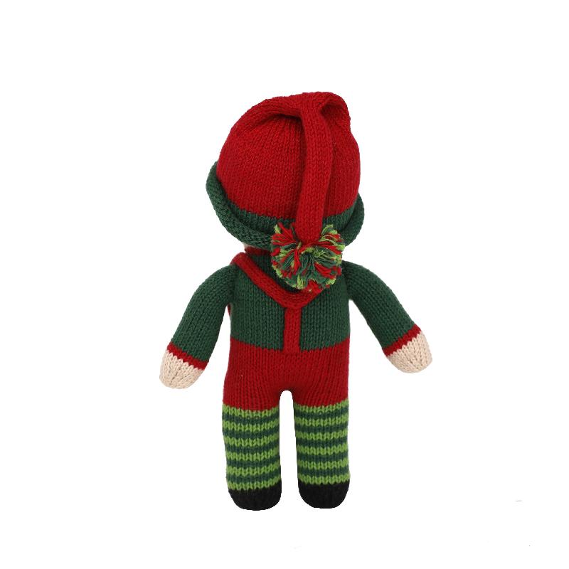 dressed in festive green and red with delightful striped leggings, this little elf is ready to spread holiday cheer. his soft knit fabric makes him perfect for cuddling, while his bright red hat and suspenders add a playful touch to his look. whether used as a decorative piece or a snuggly friend, this hand knit elf boy is sure to become a beloved part of your holiday season.