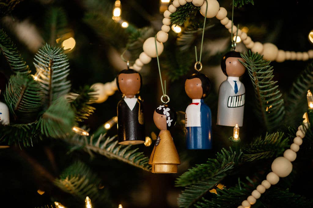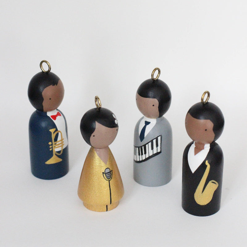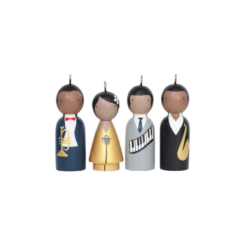 this set features 4 wooden ornaments inspired by duke ellington, louis armstrong, billie holiday, and john coltrane standing at 3" tall. this set is hand-turned on an electric lathe and hand-painted with non-toxic paint. the perfect gift for the holidays!