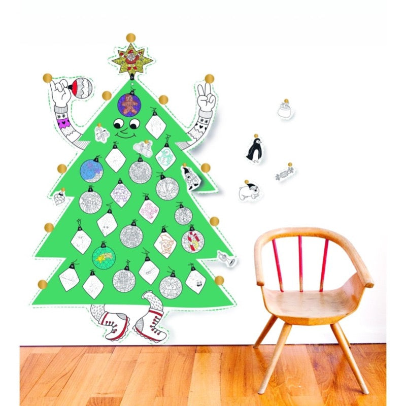 giant poster of a christmas tree to color, decorate and cut out...includes a sticker sheet of ornaments for more fun. 25 games to play and color, one for every day of december until christmas day! stick cut out tree to your wall for a beautiful and festive decoration.