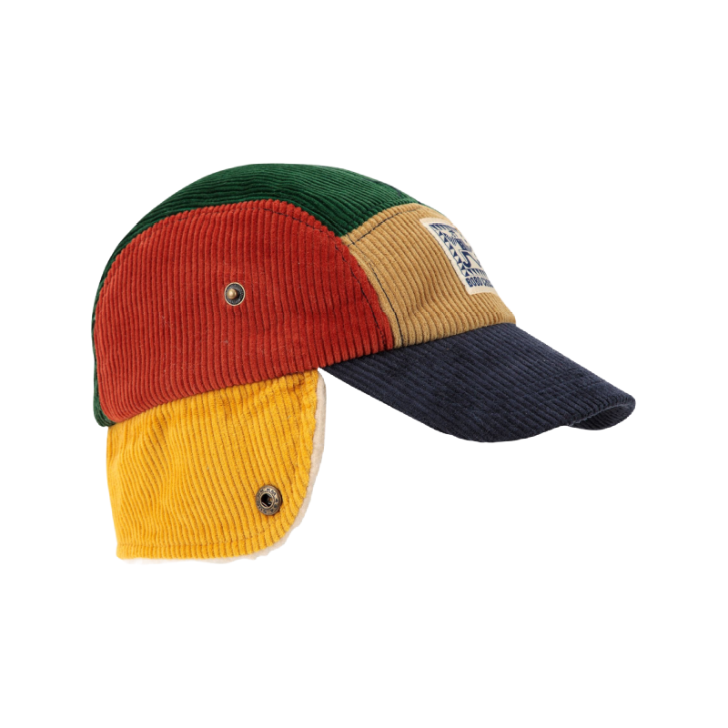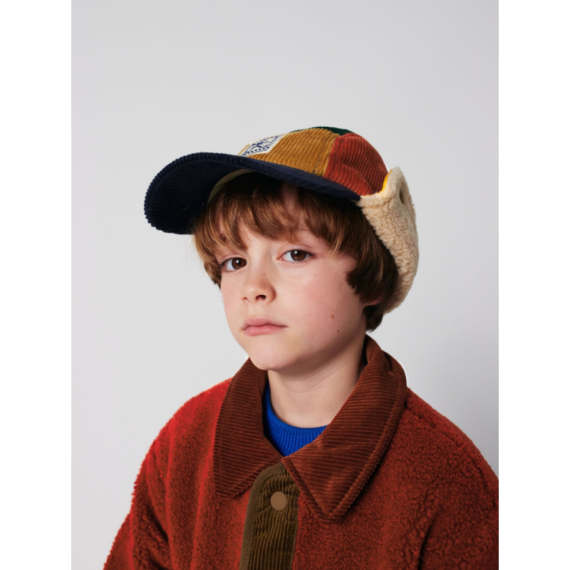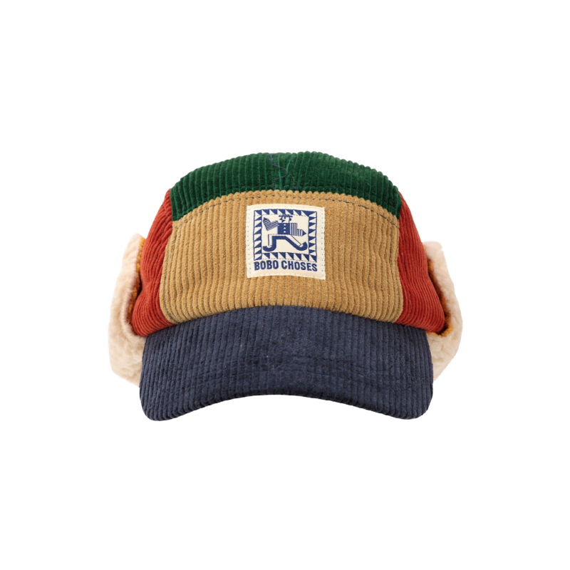 bobo choses mr pencil corduroy winter cap in multicolor. this warm, colorful corduroy hat has a hard brim and faux sheepskin lined ear flaps that can be snapped up out of the way. this hat has a color block design and the bobo choses mr pencil logo on the front.