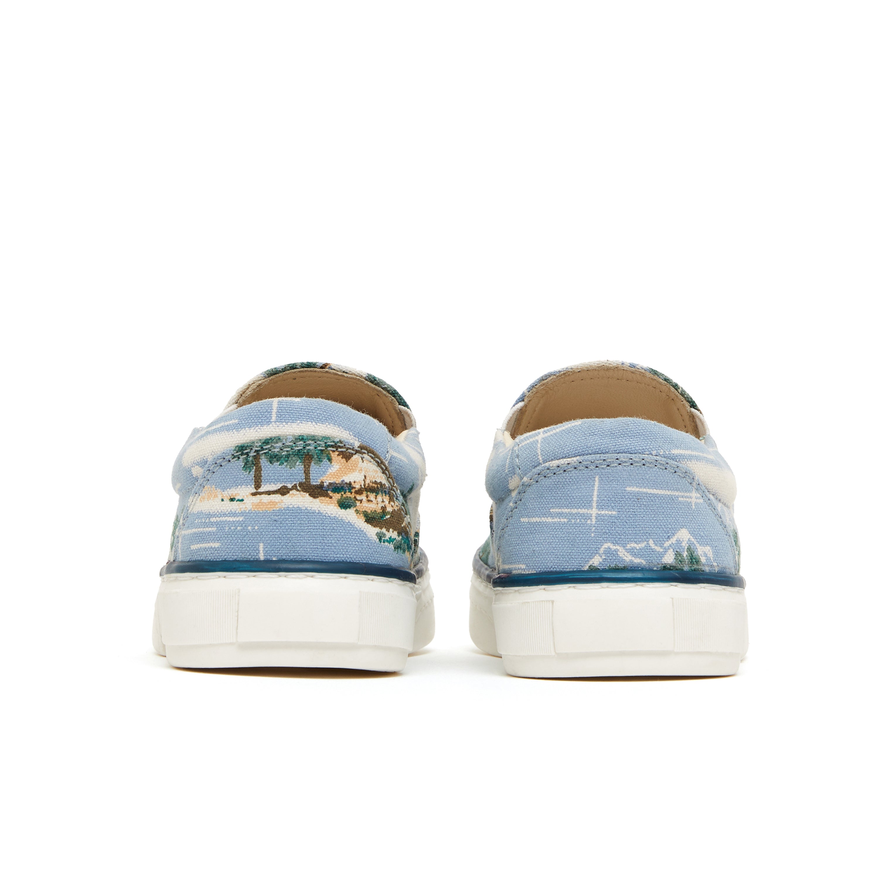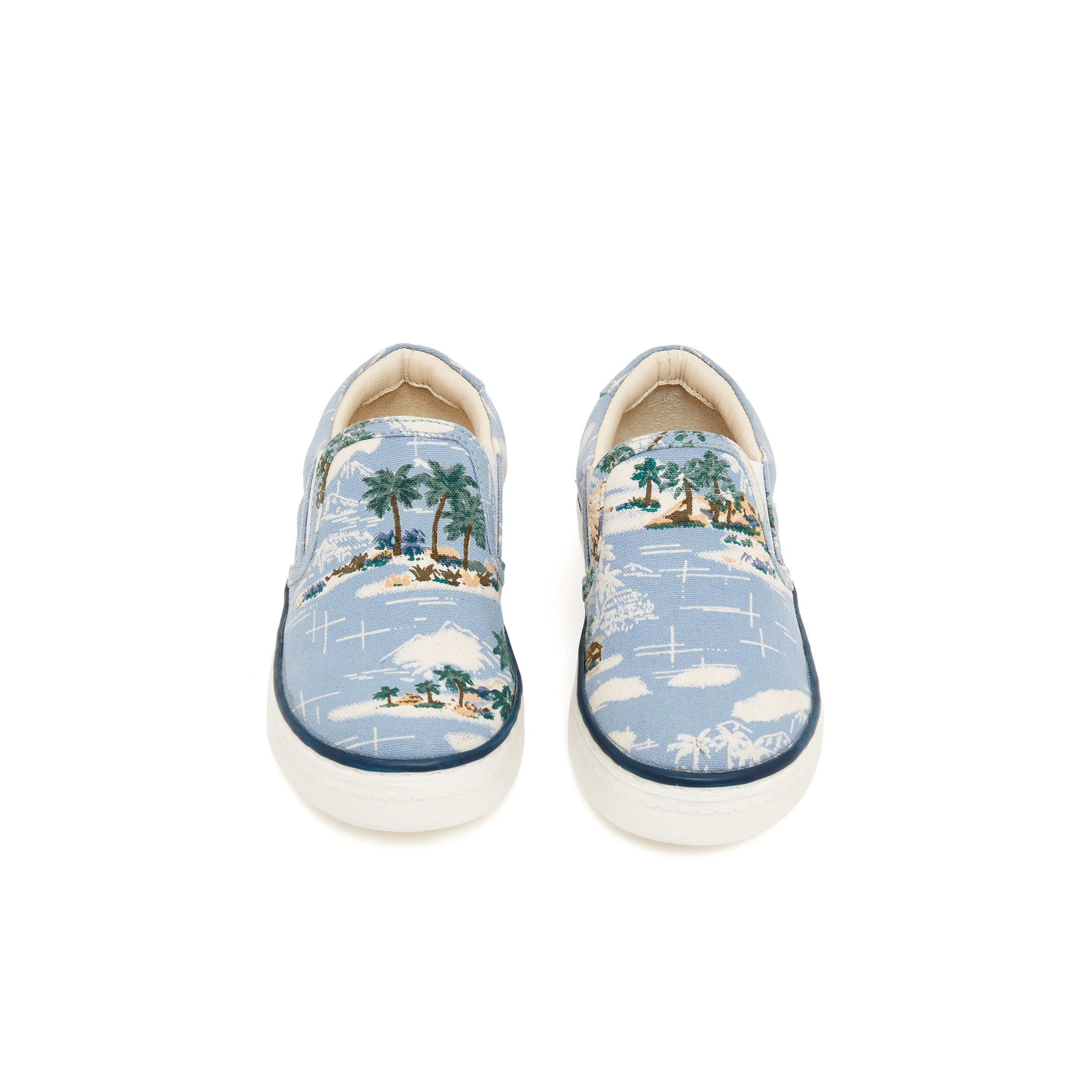 bonton hawaii slip-on sneaker in blue with all over tropical print. cotton canvas outer with soft leather lining and rubber soles.