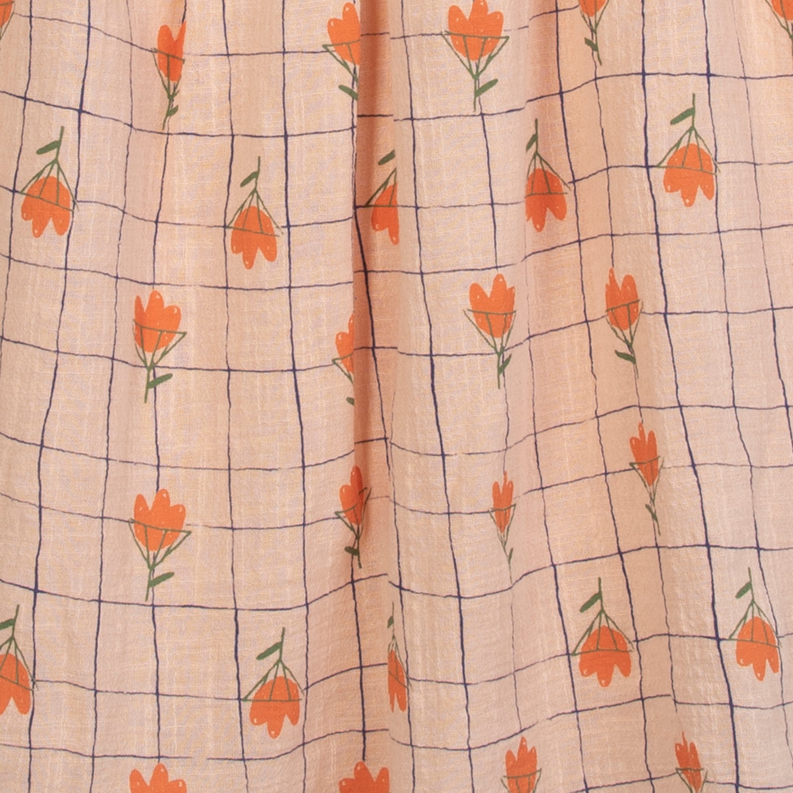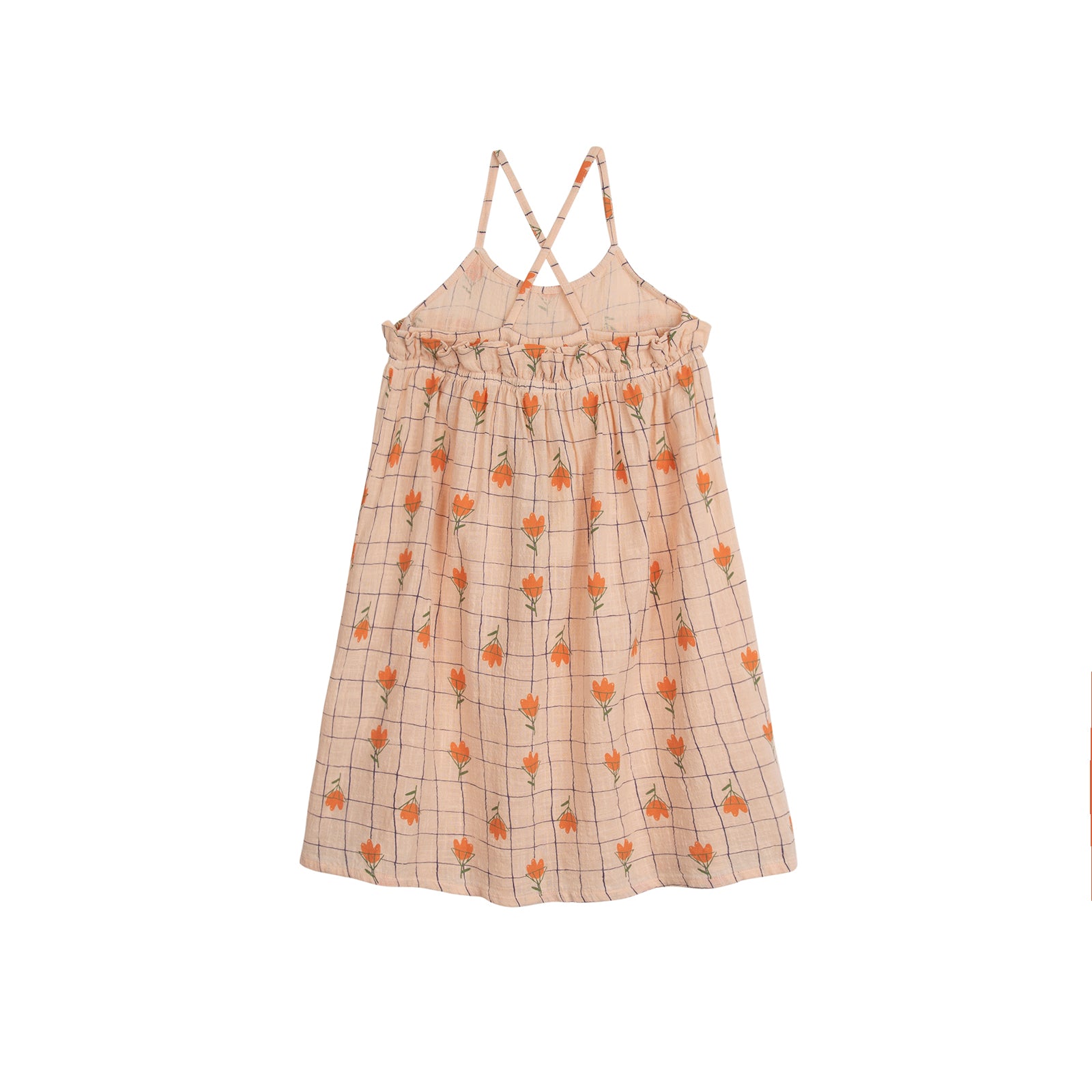 barn of monkeys flowers dress in pale peach. features include an all over flower pattern with a gathered ruffle at front and thin straps that cross at back.