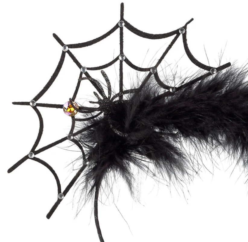 designed for daring dress‑up days and halloween fun, this stylish accessory adds a whimsical touch to any young witch or enchanted creature’s look. a striking spider‑web pattern sits atop soft, fluffy black feathers, giving off just the right eerie‑elegant vibe tiny gemstone appliqués add gleaming accents to catch the light, wrapped around a sturdy metal headband.
