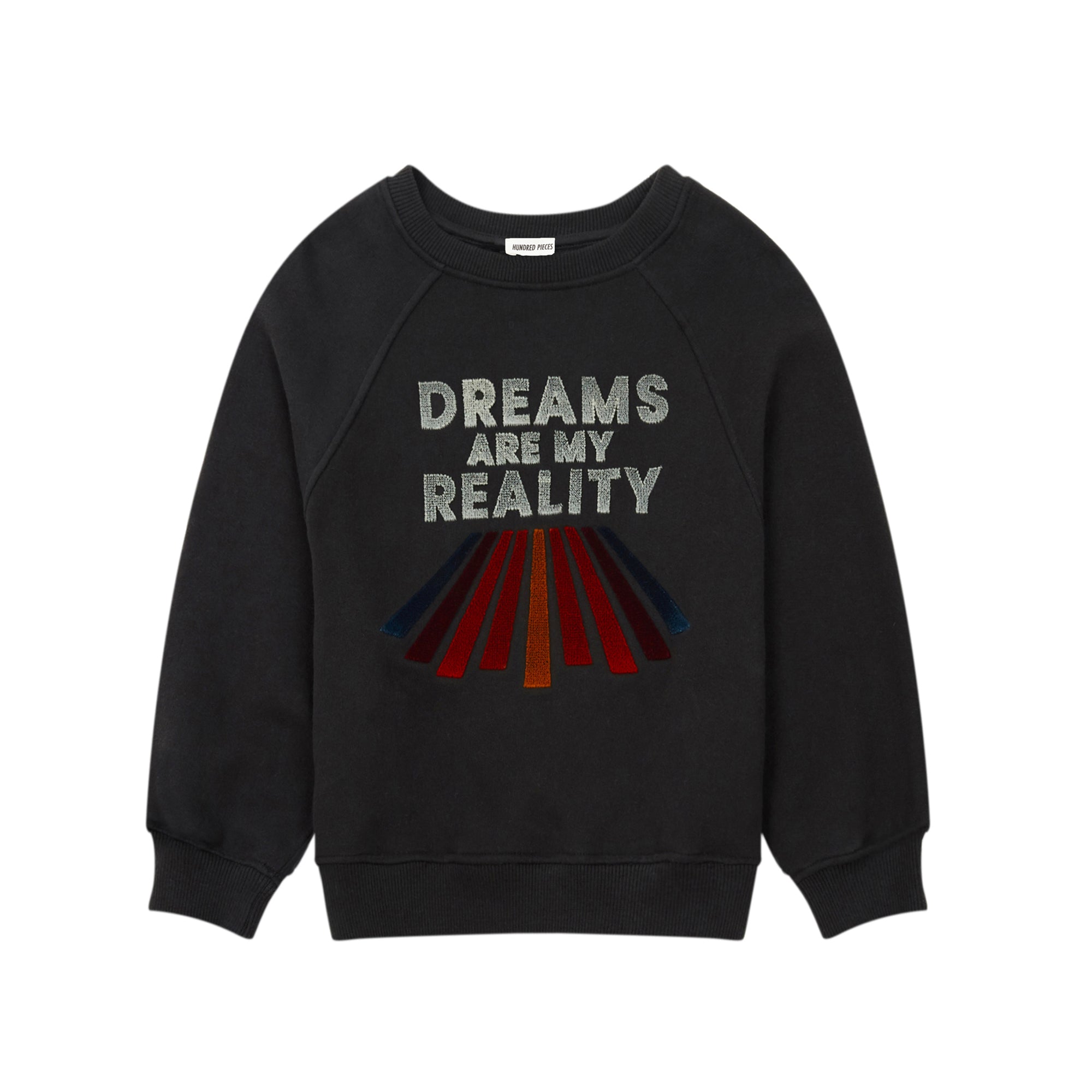 hundred pieces dreams sweatshirt in licorice. this long sleeve cotton fleece sweatshirt features a "dreams are my reality" embroidery on front and ribbed edges. super soft fabric.