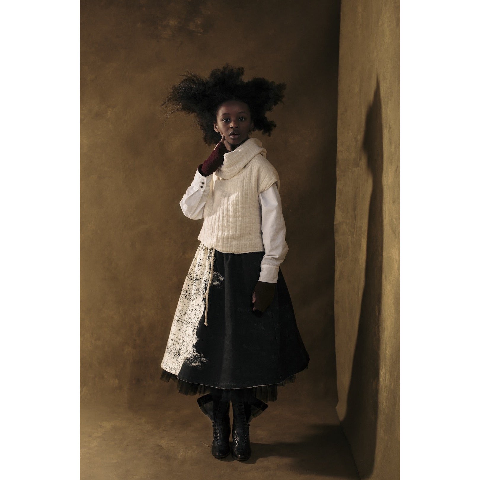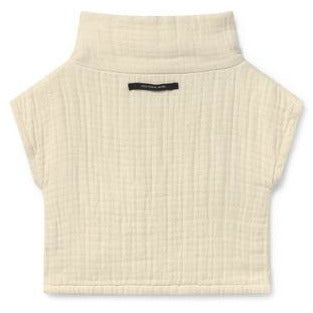 little creative factory short jersey crop top in quilted organic fabric. roll neck and sleeveless. raw hems with overlock finish.