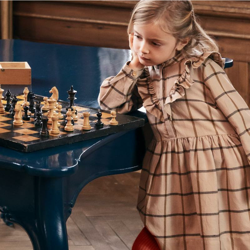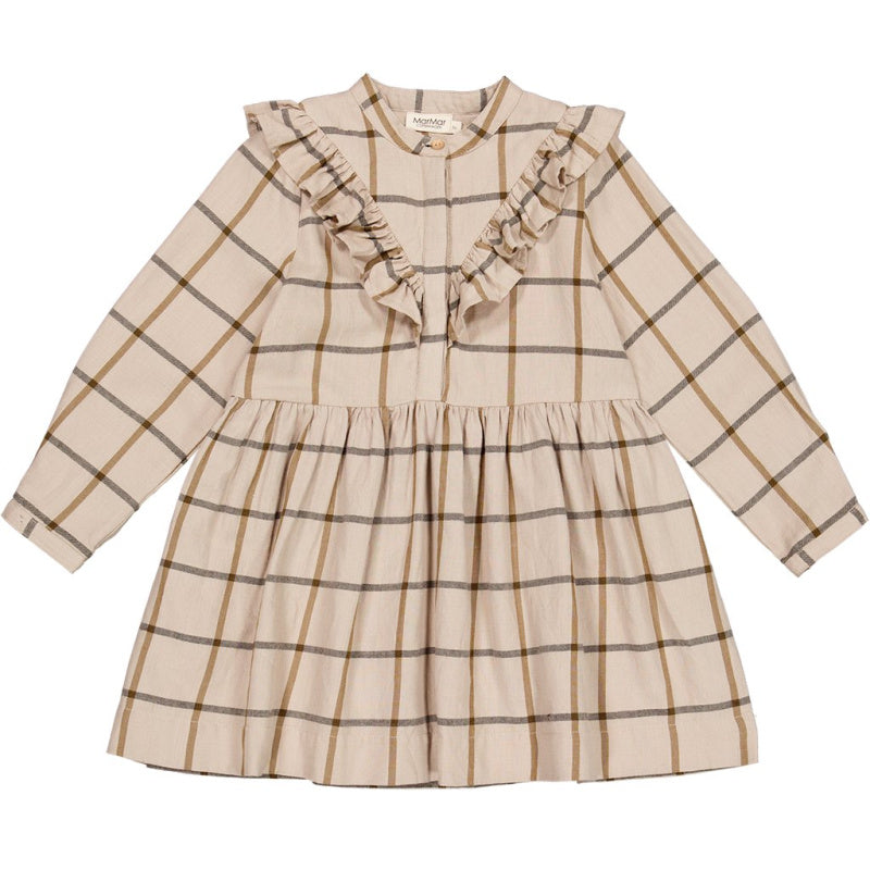 marmar copenhagen dalja long sleeve dress in the llama check pattern features an a-line skirt and ruffle detailing at the shoulders. hidden button closure on front.