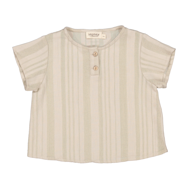 marmar copenhagen tagola ss top in llama. this short sleeved blouse features a round neck with a button closure. perfect fabric for warmer summer days!