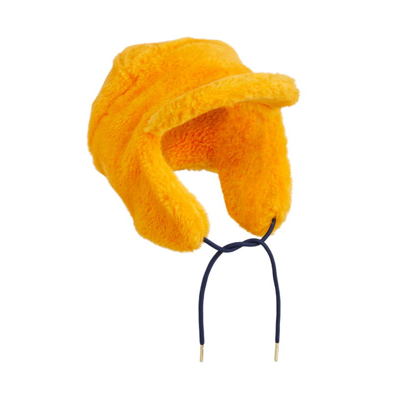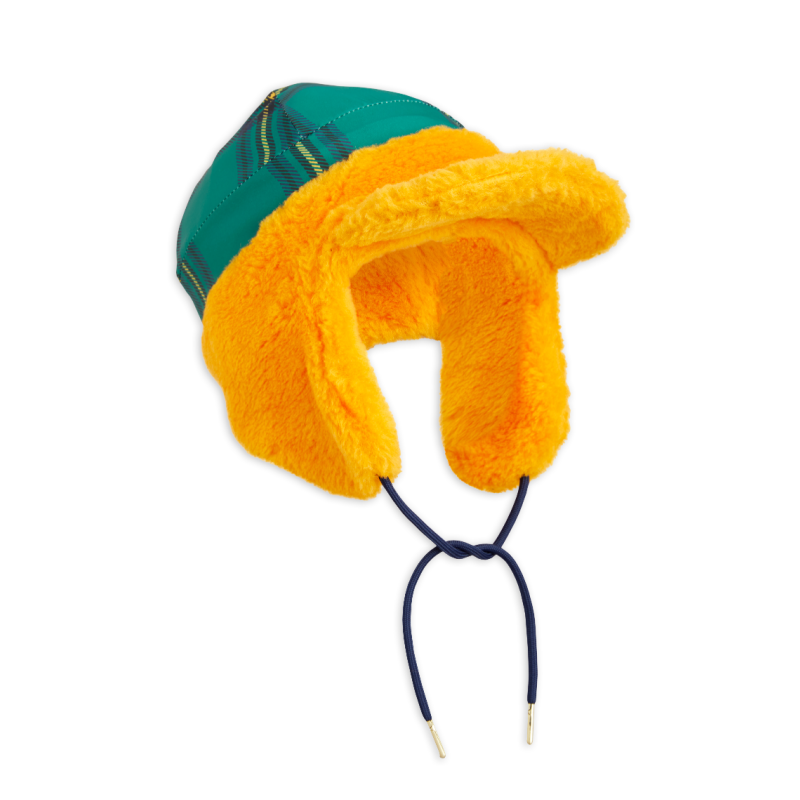 mini rodini faux fur cap in yellow. orange reversible faux fur cap with a green check flannel lining made from the cap is warm and designed with earflaps and strings to tie under the chin.