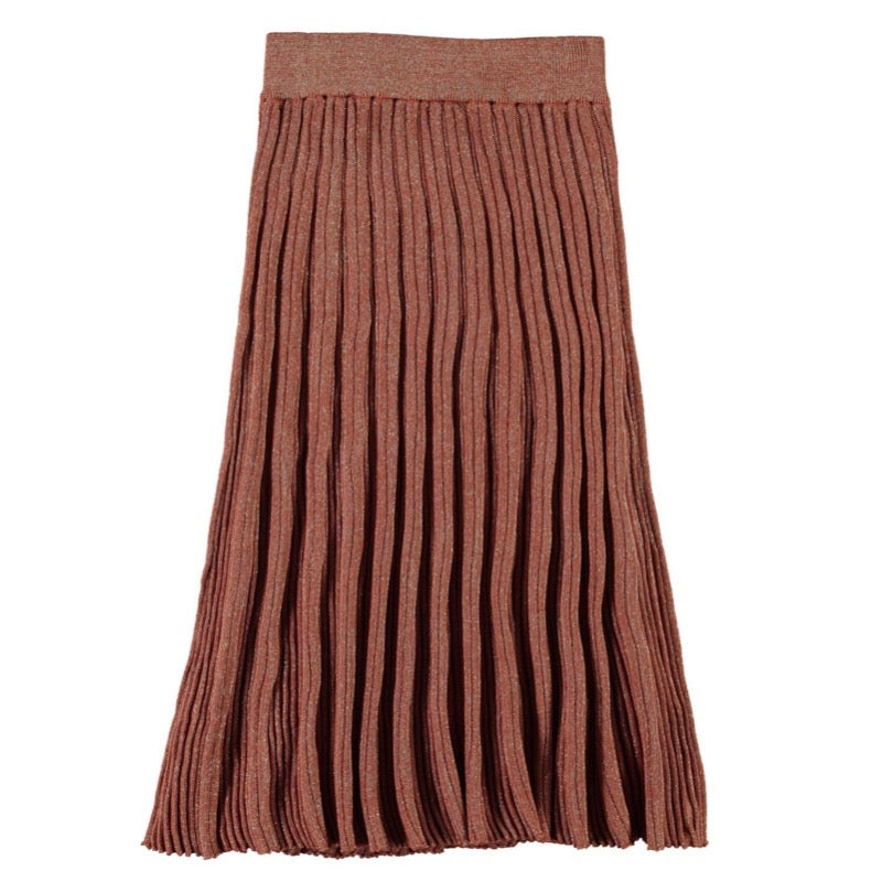 molo beatrice long, brick colored midi pleated skirt with glitter. a slim fit with soft elasticated waist.