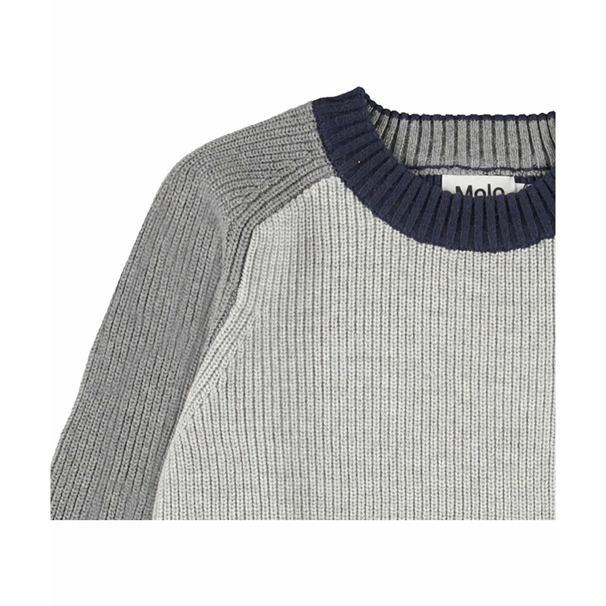 molo bosse cotton knit top in light grey, with a dark grey sleeve, a dark blue sleeve and blue on the back. designed with a rib at the neck, sleeves and bottom.