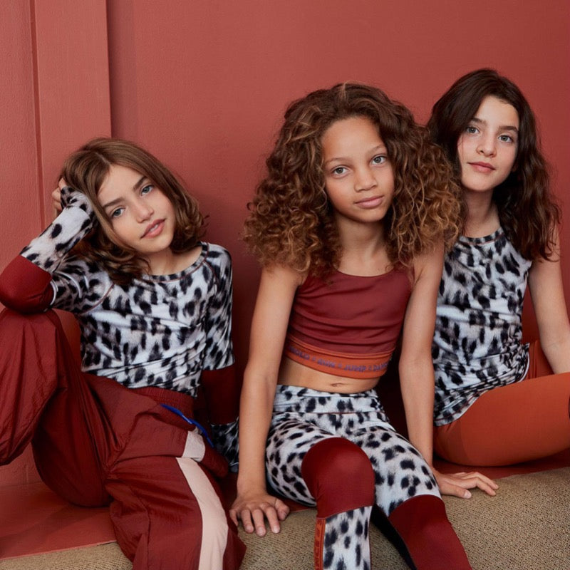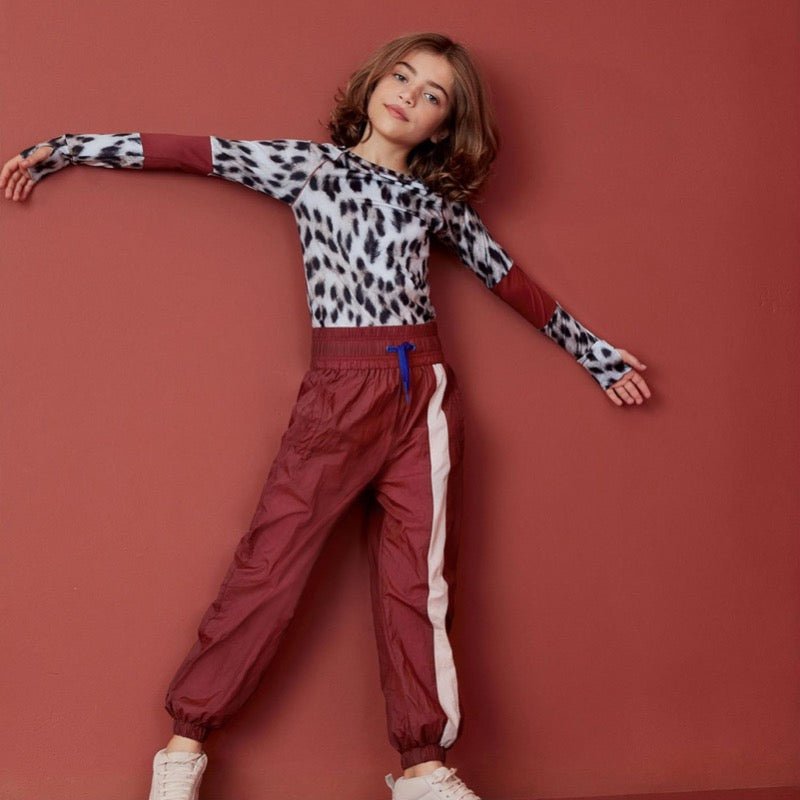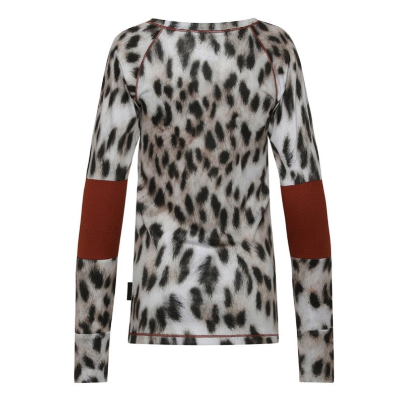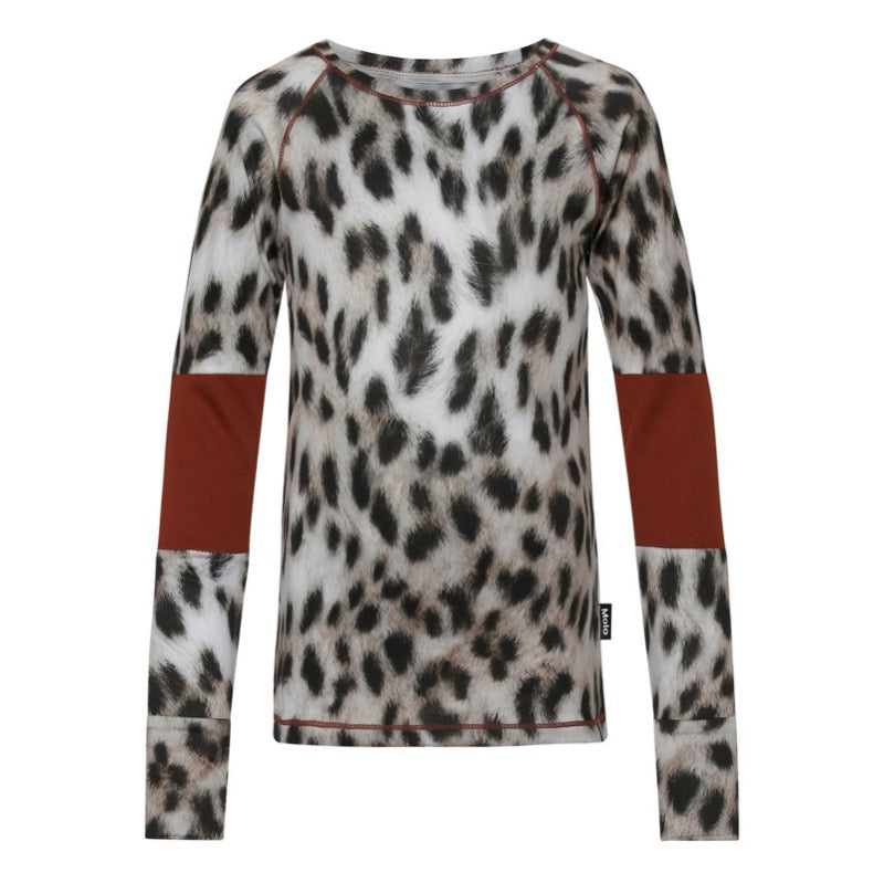 molo odelia long sleeve sports top in an all over snow leopard print with contrast burgundy stripes on sleeves.