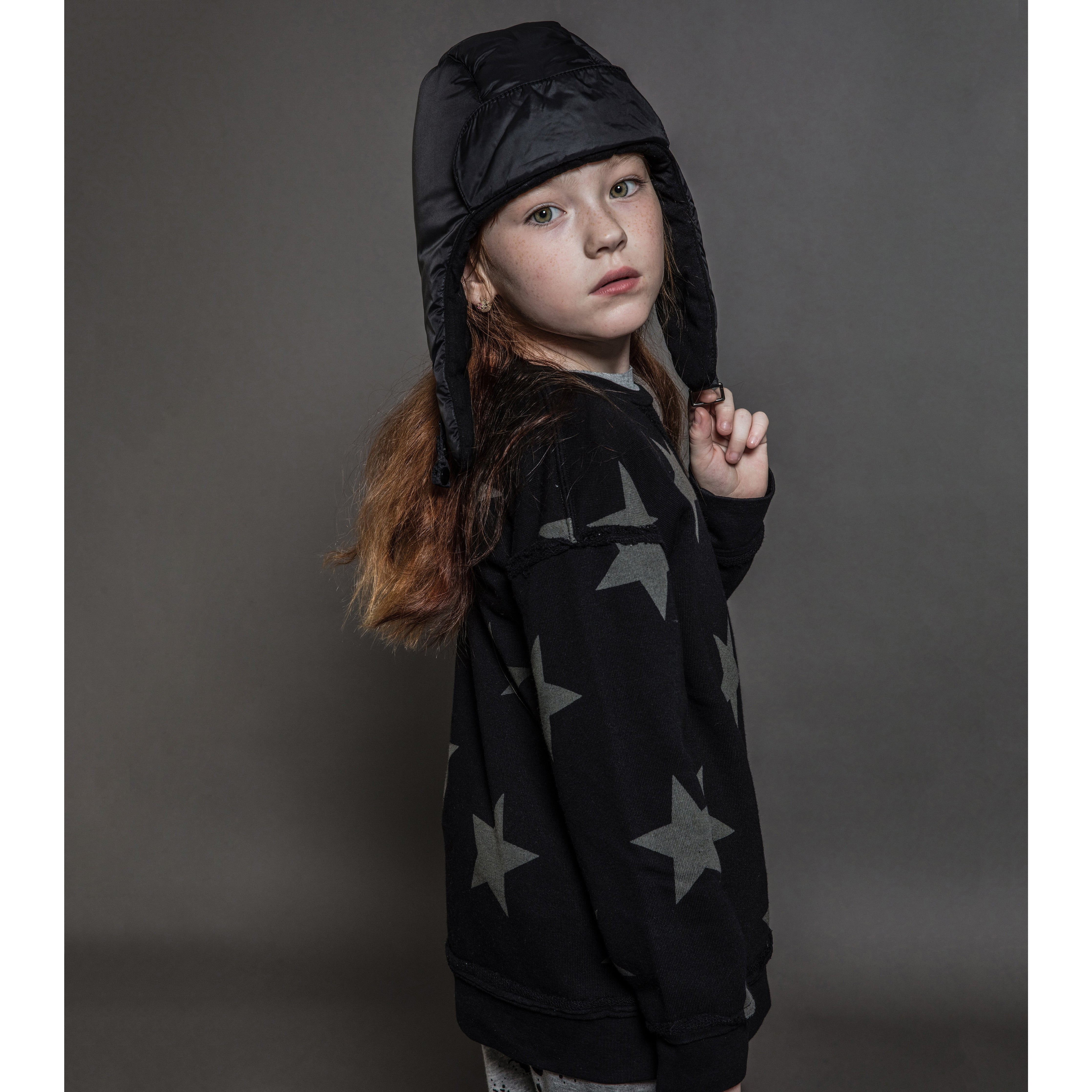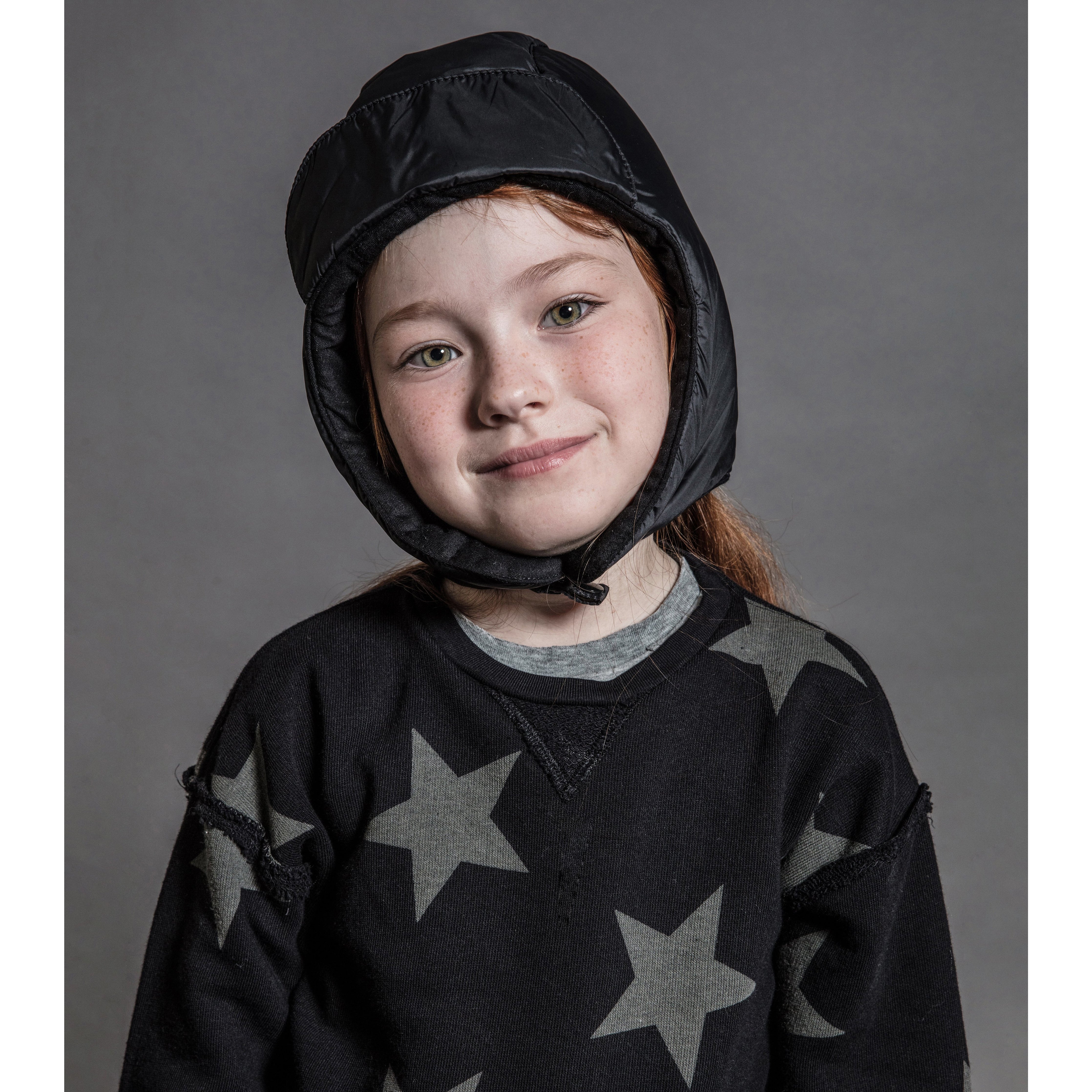 like snoopy & amelia earhart, boys & girls can rock an aviator hat and get that classic cool vibe with zero effort. this down hat comes in our black in a nylon sheen with cozy cotton innards. feels good against the face when you strap it on under the chin. great for sled-riding or just jumping in the car to go the store with mom.