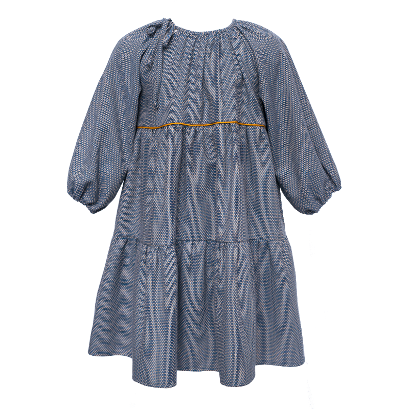 paade mode fall winter girls collection midi dress in blaise blue. this chambray-like dress features a round neckline with a small bow detail on the right shoulder, an allover flowy fit and mid-length sleeves with elasticated cuffs.