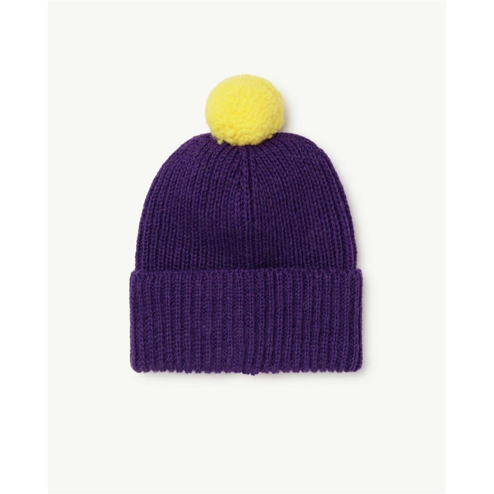 the animals observatory arty pony baby hat in purple with yellow pom pom and small yellow TAO logo on front.