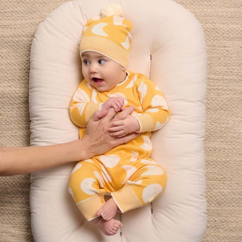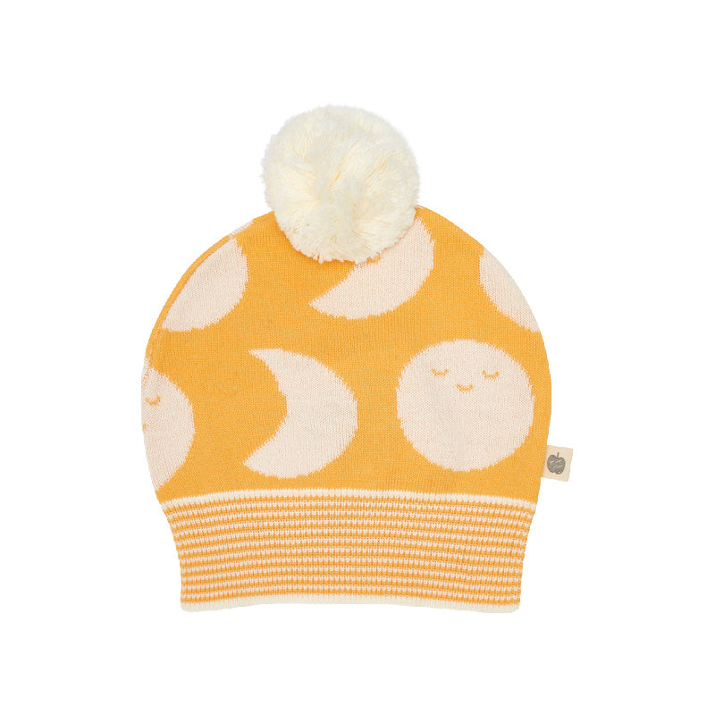 the bonnie mob tunnock knit baby hat in yellow with cream moons print. the hat has a ribbed edge in a cream and yellow stripe pattern and is topped with a cute cream colored pom pom.