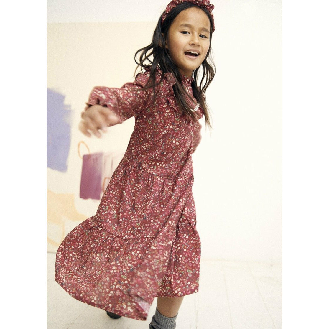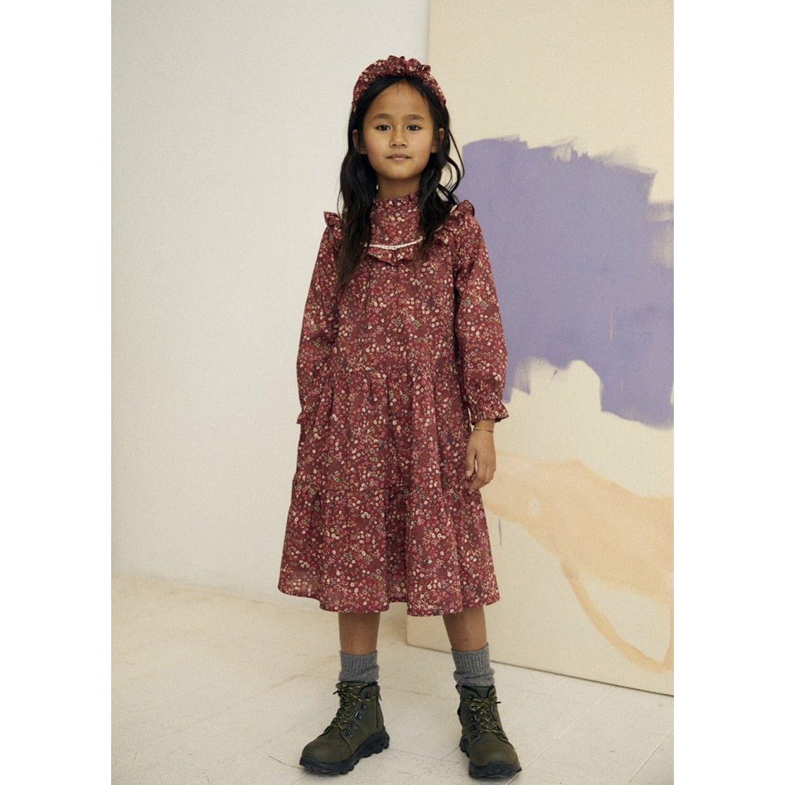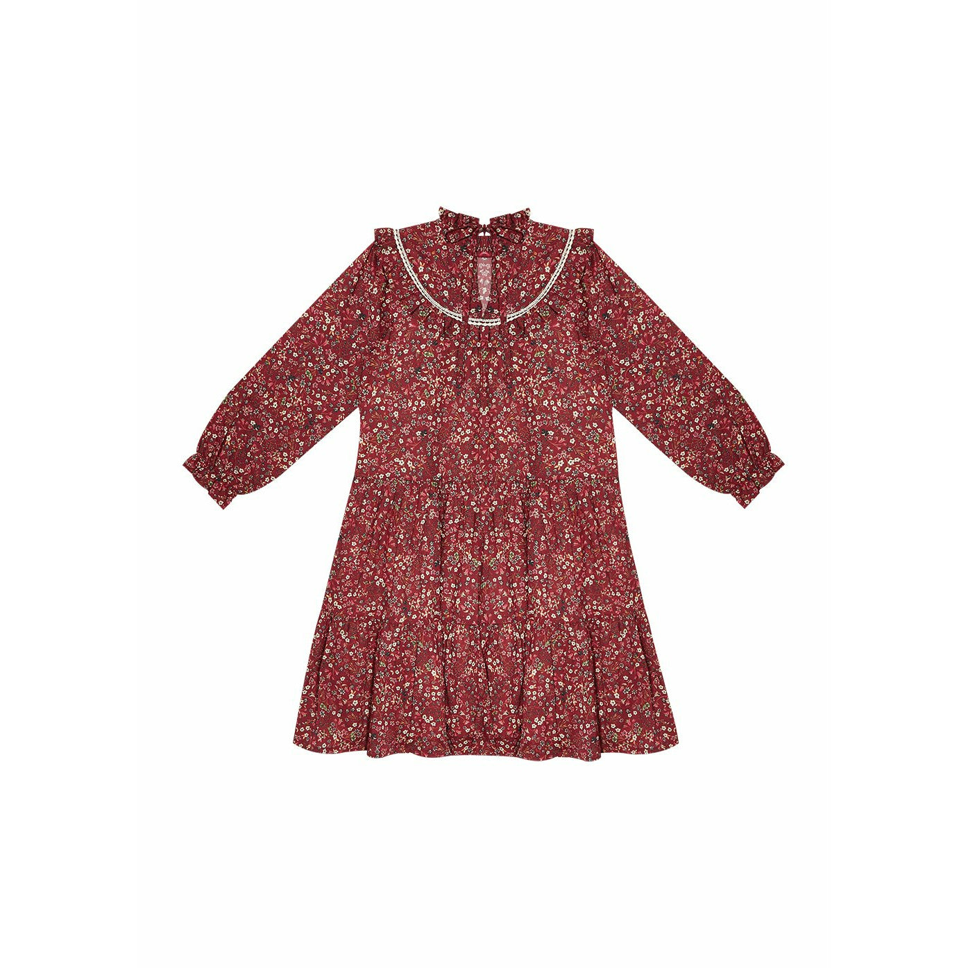 the new society bernadette dress in liberty print. below knee dress with long sleeves and cotton lace detail on bodice.