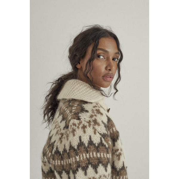 the new society women's chunky knit cardigan with argyle inspired pattern. features a collar and ribbed edges in cream.