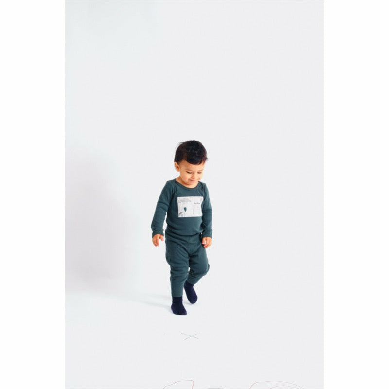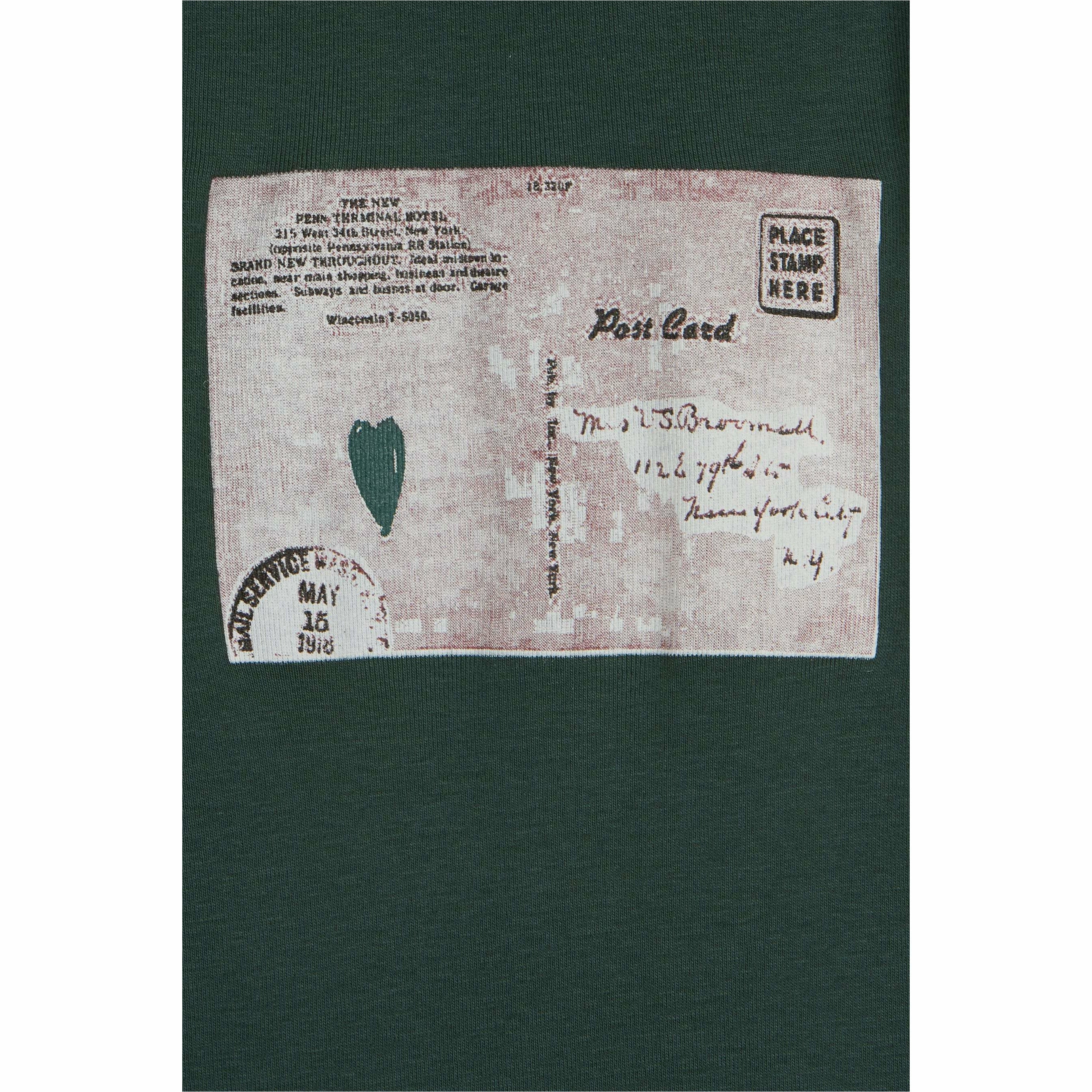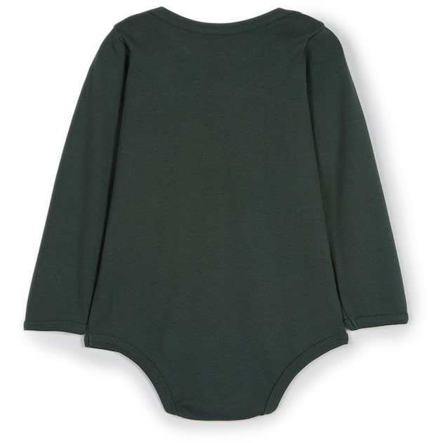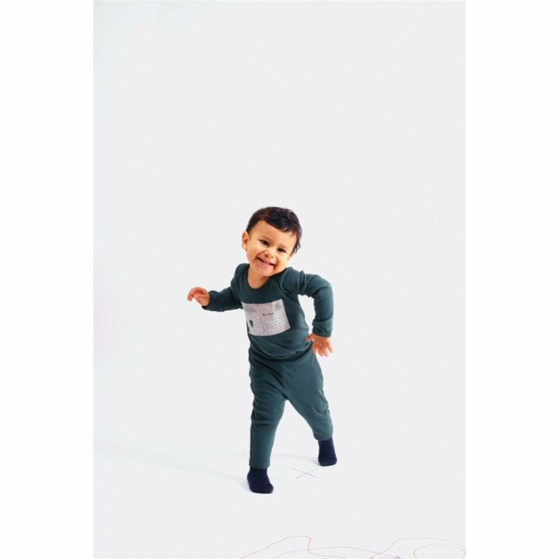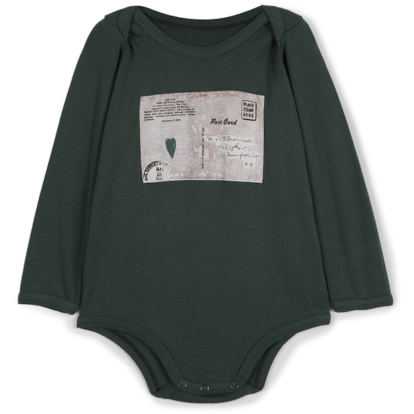 wolf & rita artur onesie in green with postcard graphic across the front. features a snap button closure for easy changes.